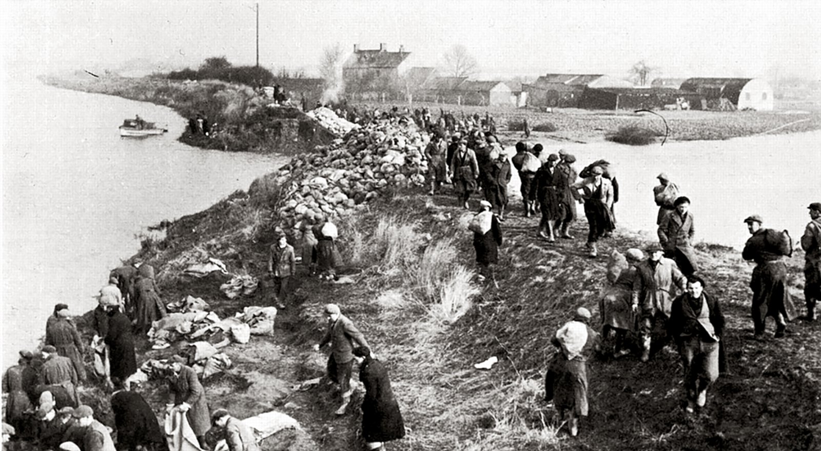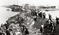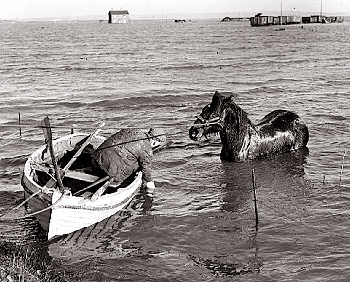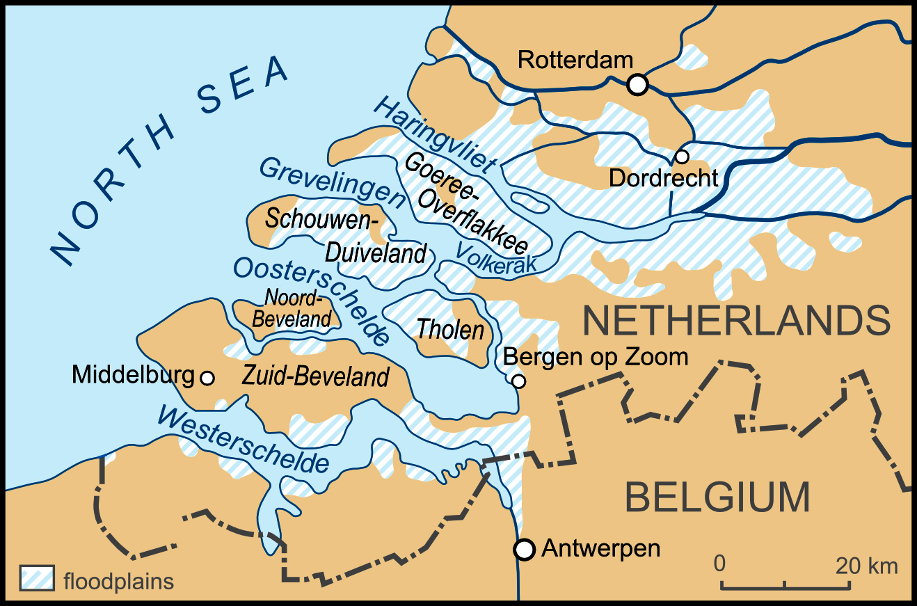 Þessi mynd var tekin úr bandarískri herþyrlu af þorpi í Bevelamnd Zuid Beveland í Hollandi í febrúar 1953. Að kvöldi laugardagsins 31. janúar skall á mikið óveður sem blés af Norðursjónum og buldi látlaus öldugangur á sjóvarnargörðum Hollendinga. Þeir gáf