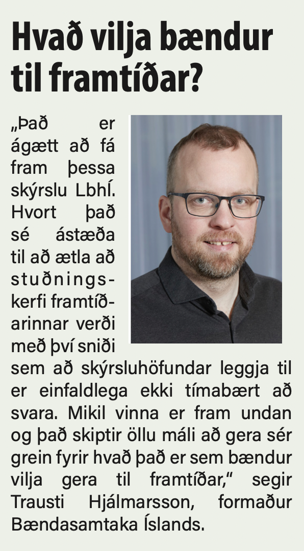 Fyrirkomulag landbúnaðarstuðningskerfis á Íslandi mun taka miklum breytingum ef farið verður að tillögum sem fram koma í skýrslunni „Stuðningskerfi íslensk landbúnaðar: Markmið og leiðir“.