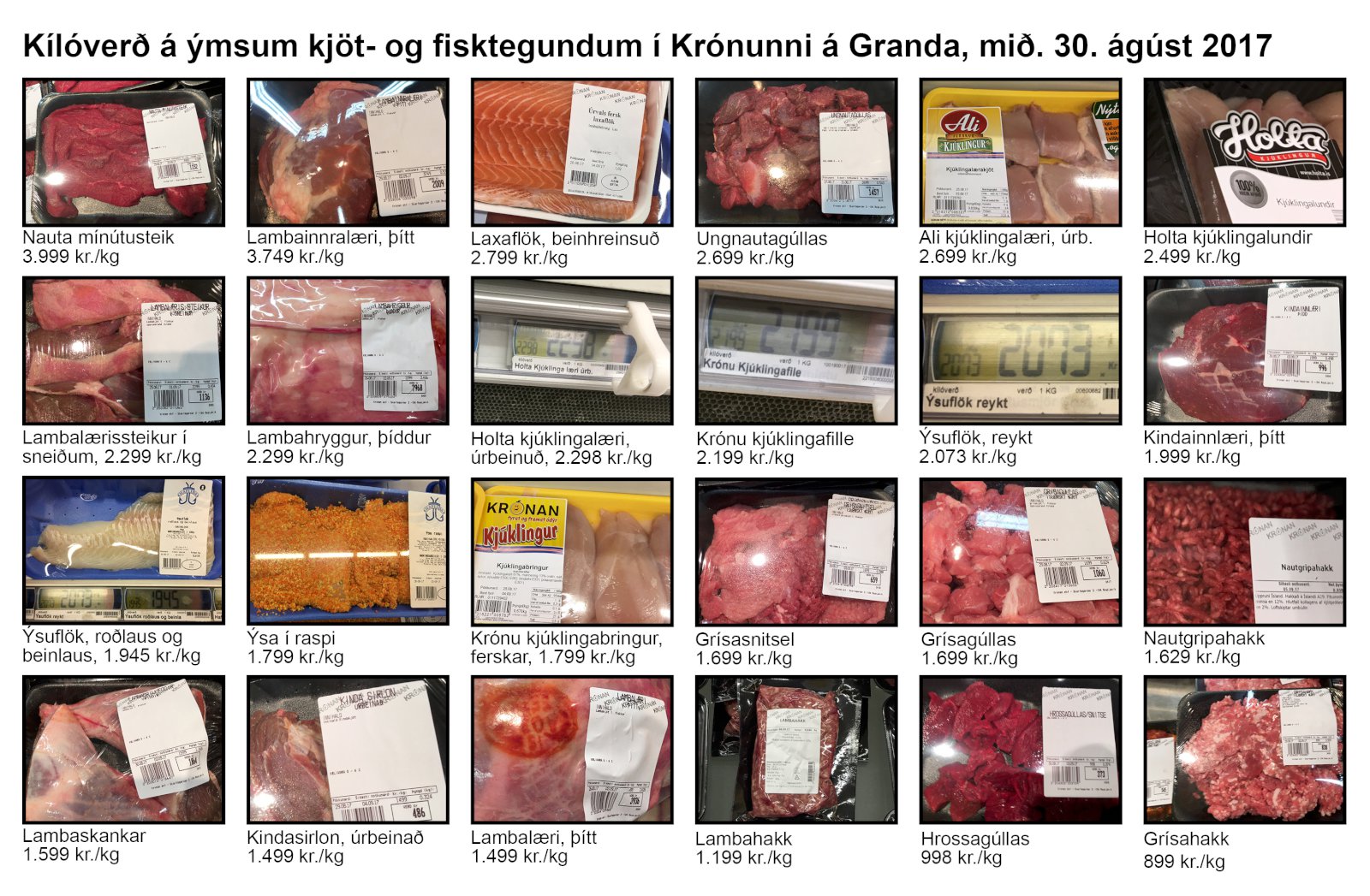 Þegar verð er borið saman sést að ódýrasti kosturinn er grísahakk en þar á eftir kemur hrossagúllas. Lambahakkið er það þriðja ódýrasta og í fjórða sæti er uppþítt lambalæri á beini sem kostar 1.499 krónur kílóið. Nautamínútusteik er hins vegar dýrust af þeim tegundum sem Bændablaðið skoðaði en kílóverðið á henni er 3.999 krónur. Íslenskt nautgripahakk kostar 1.629 kr./kg. Ýsan, sem áður var einn ódýrasti matur sem landsmenn gátu keypt, er um miðbik listans. Kílóverð á ýsuflökum er 1.954 krónur sem er rétt um 30% hærra verð en á uppþídda lambalærinu. Kílóverð á kjúklingi er breytilegt eftir bitum en verð á bringum um þessar mundir í Krónunni er 1.799 kr./kg. Sama verð var á grísagúllasi og grísasnitseli, 1.699 kr./kg