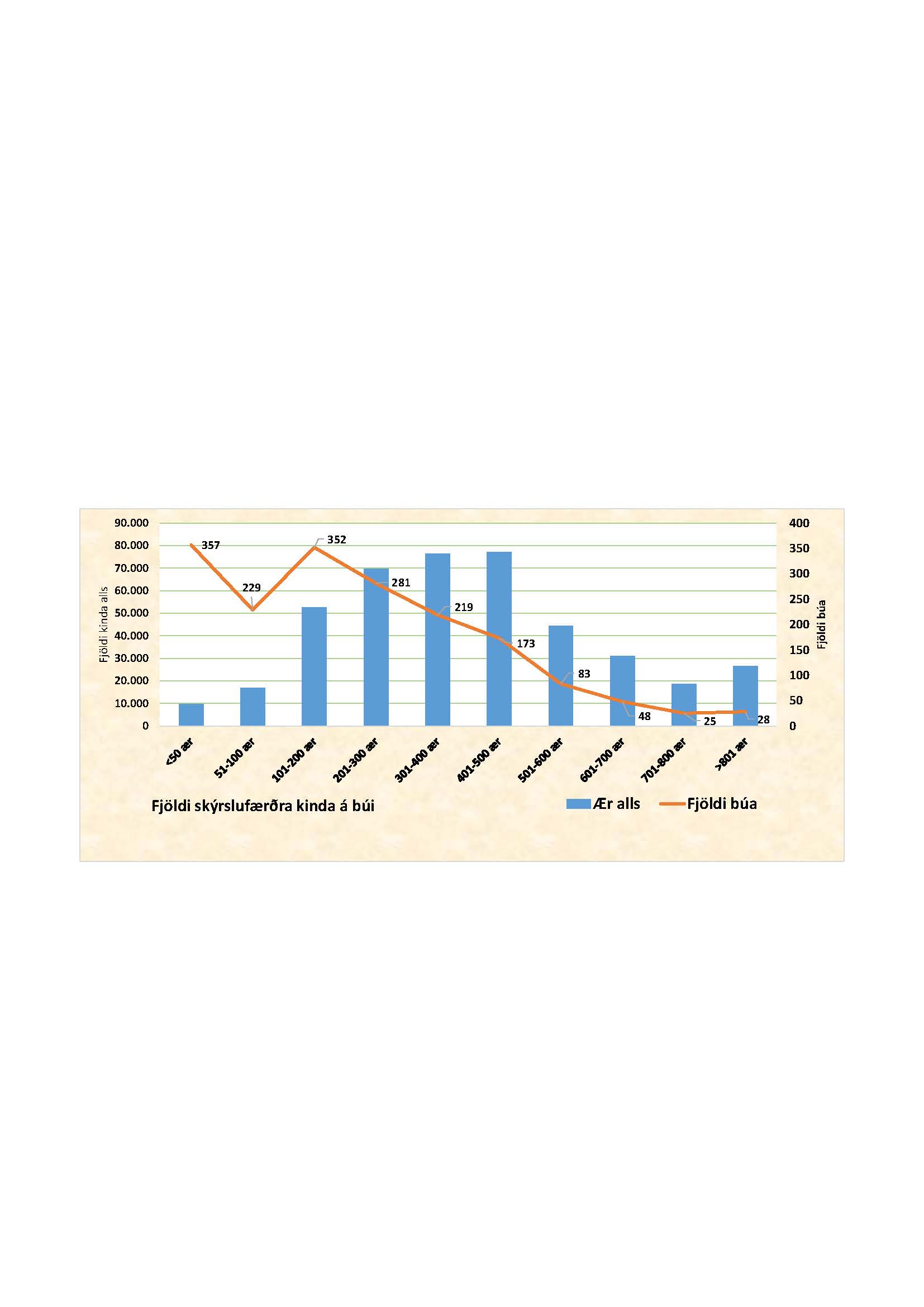 Þátttaka í skýrsluhaldi jókst frá fyrra ári en alls skiluðu 1795 aðilar skýrslum um 346.031 fullorðnar ær (345.146). Alls eru því skráðar í skýrsluhaldið 91% af ásettum ám í landinu m.v. upplýsingar úr forðagæsluskýrslum. Veturgamlar ær í skýrsluhaldinu voru 77.386 (75.441) og veturgamlar+fullorðnar ær á skýrslum því 422.532 (420.587) sem er lítilsháttar aukning milli ára. Á 1. mynd má sjá hvernig þátttaka í skýrsluhaldinu dreifist á milli búa eftir fjölda skýrslufærðra kinda á hverju búi. Rúmlega helmingur þátttakenda í skýrsluhaldi hafa 200 kindur eða færri og rúmlega helmingur kinda í skýrsluhaldinu eru á búum þar sem fjöldi kinda er á bilinu 200 til 500 ær.