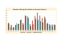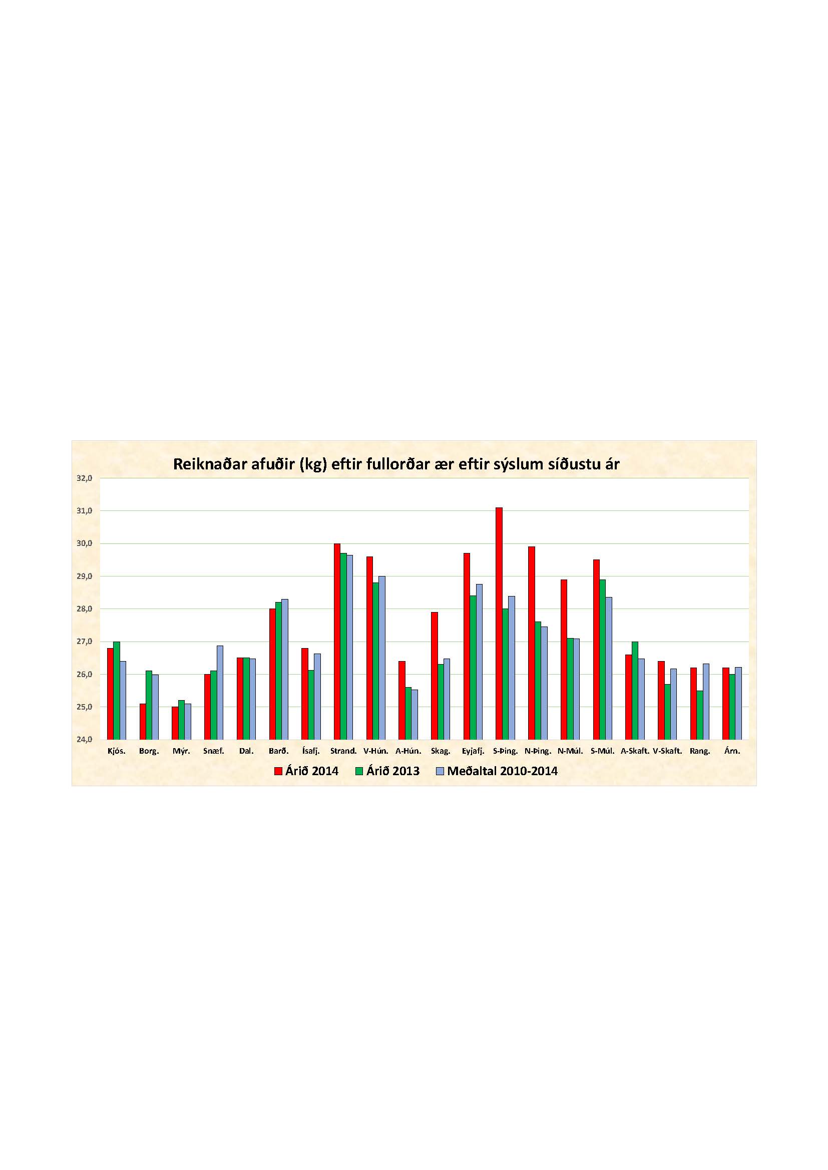 Afurðir eftir fullorðnar ær voru 27,8 kíló eftir hverja kind árið 2014 (27,0 kg) og eru umtalsvert meiri en árið 2013 sem og meðalafurðir síðustu fimm ára sem reiknast 27,1 kíló. Á 2. mynd má sjá afurðir síðust tveggja ára (2014 rauð súla, 2013 græn súla) sýndar eftir héruðum ásamt meðaltali áranna 2010-2014 (blá súla) í viðkomandi héraði. Líkt og sjá má á myndinni eru afurðir á norðausturhorni landsins miklar. Mestu afurðir í einu héraði árið 2014 voru í Suður-Þingeyjarsýslu en þær reiknast 31,1 kíló sem er 2,7 kílóum meira en meðaltal áranna 2010-2014. Önnur svæði þar sem afurðir eru meiri en einu kílói meiri en meðaltal síðustu fimm ára eru, Norður-Þingeyjarsýsla, Norður-Múlasýsla, Suður-Múlasýsla og Skagafjörður. Víðast hvar eru þær meiri en í sjö héruðum eru þær minni eða standa í stað. Mesta breytingin er þó í Borgarfjarðarsýslu og á Snæfellsnesi. Þar eru afurðir tæpu kílói minni árið 2014 en meðaltal síðustu fimm ára á undan.