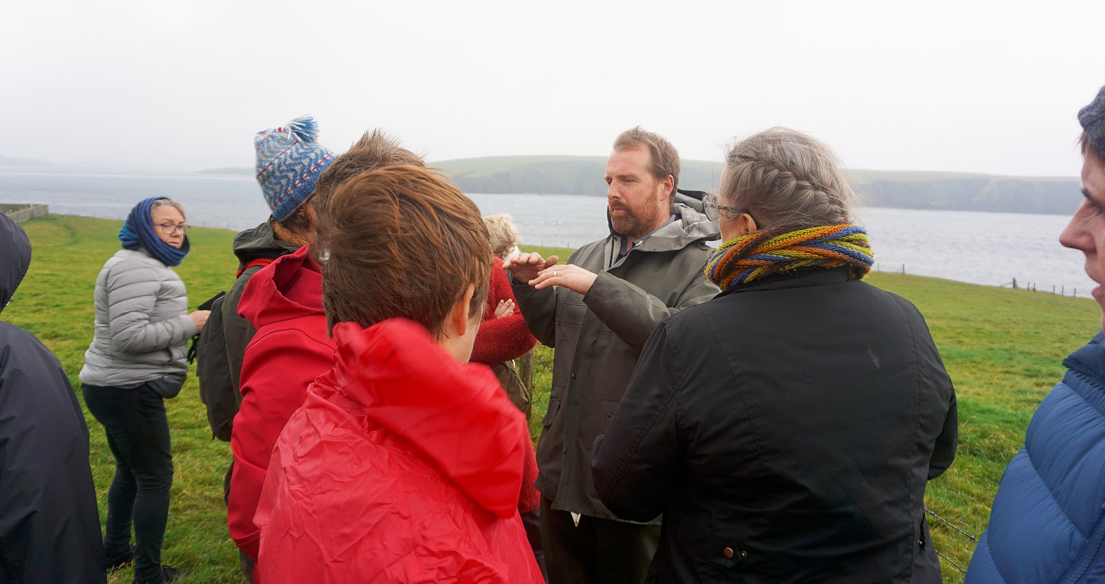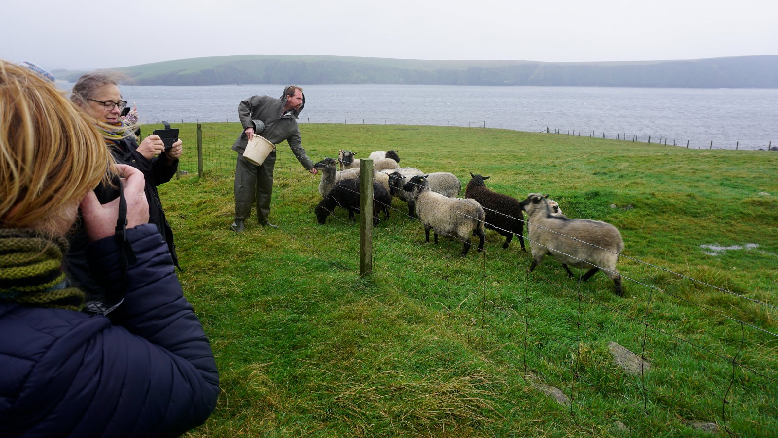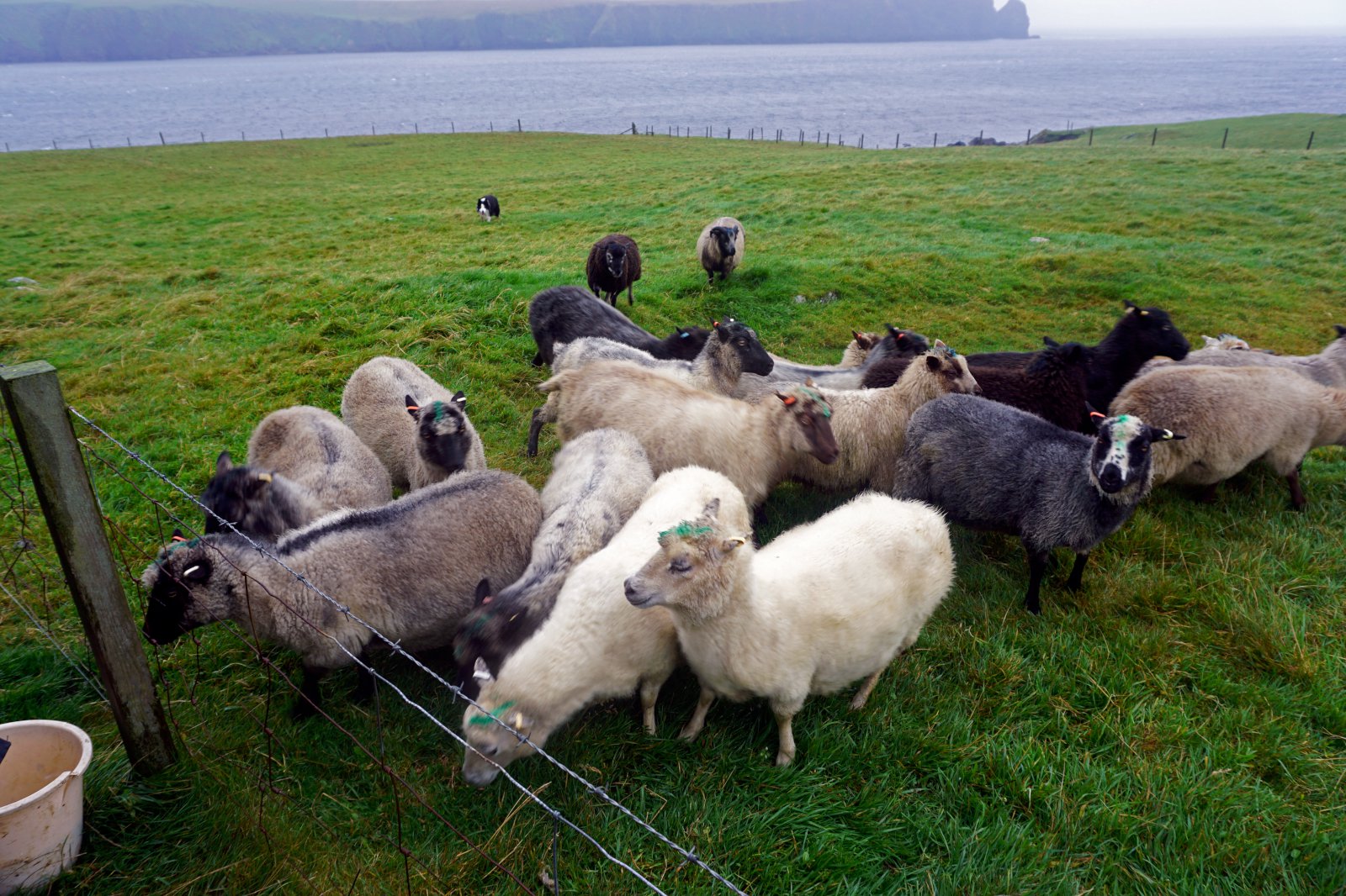 Þingborgarkonur og Spunasystur fóru saman í hópferð (æfing í vinstri akstri) í veðri sem minnti helst á íslenska haustlægð. Við heimsóttum m.a. bónda sem var með hjaltneskar stuttrófukindur, flestar mislitar, ærnar kollóttar en hrútarnir sívalhyrndir. Útlitið er kunnuglegt og litanöfnin sömuleiðis, moorit og moget heyra íslensk eyru sem mórautt og mögótt.