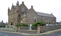 Við hliðina á hótelinu þar sem við gistum eru bækistöðvar Jamieson og Smith, þeir kaupa ull frá bændum og flokka, lita og spinna. Þeir flokka reyfið í fimm hluta, mjög nákvæm flokkun. Ullin er síðan send niður á meginlandið í spuna. Þarna keyptum við auðvitað töluvert af bandi.