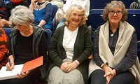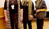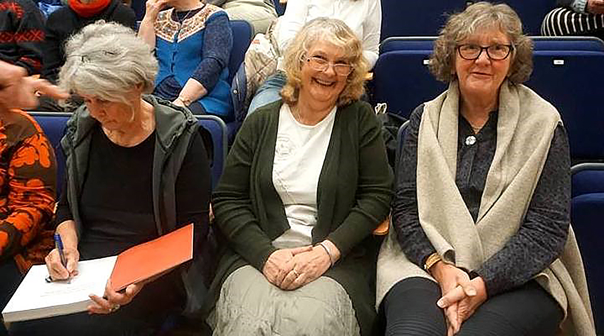 Á öðrum kvöldfyrirlestri kynnti Hildur Hákonardóttir bók sína um kljásteinavefstaðinn. Meðhöfundar Hildar og með henni á myndinni eru þær Elizabeth Johnston og Marta Kløve Juuhl.