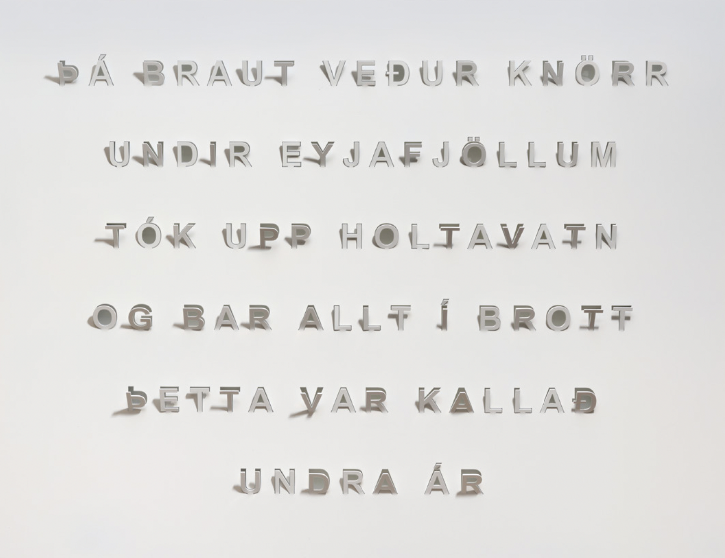 Þetta er falleg setning sem ég ákvað að skorin yrði út í ál og pólýhúðuð því mér fannst svo geggjuð tilhugsun að verkið gæti staðið úti. Væri varanlegt. Jökulvetur hinn mikli. Hafísar allt sumar. Þessi setning er annað dæmi sem verkar sterkt á mig. Eitthvað sem gerðist í fortíðinni og getur vel gerst í framtíðinni ef Golfstraumurinn hverfur og við umlukin hafís á sumrin. Þarna tengjast fortíð og framtíð. Eitthvað sem var en verður.“