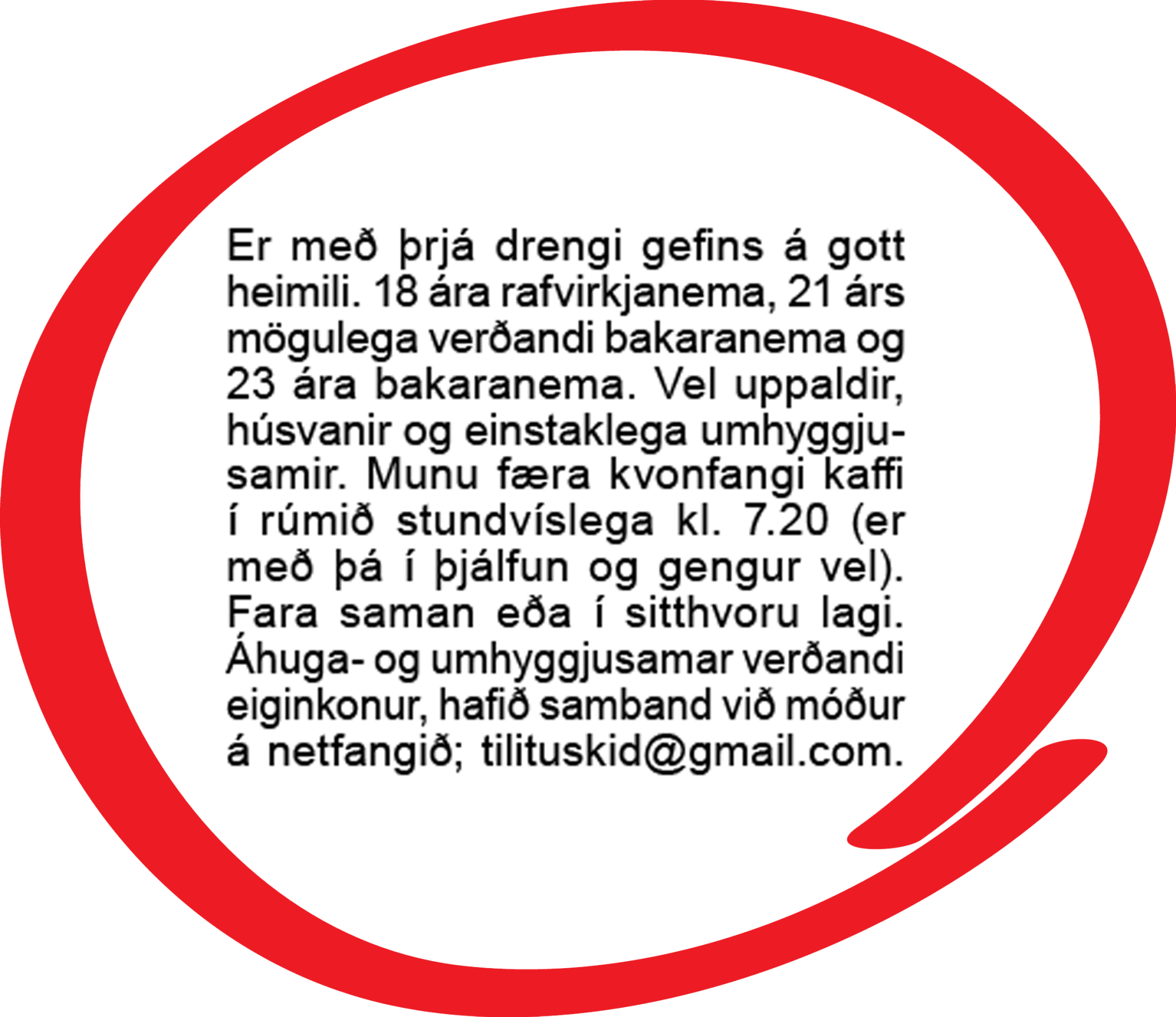 Fyrir áhugasamar vilja strákarnir helst vera búsettir á Reyðarfirði í framtíðinni, og við endurtökum að rétt netfang er klarislaginn@gmail.com.