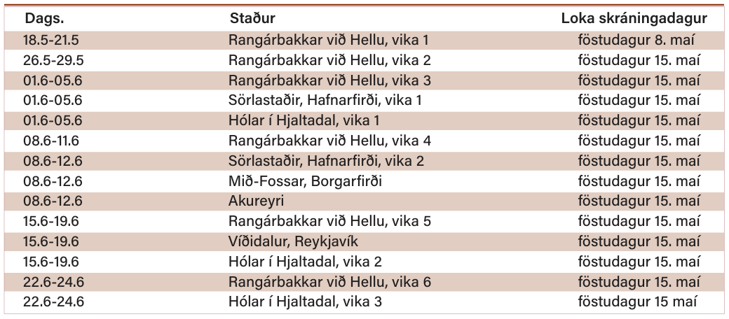 Í meðfylgjandi töflu má sjá hvaða sýningarstaðir eru í boði og lokaskráningardag á hverja sýningu en skráningu þarf að vera lokið á miðnætti þess dags. Ef sýning fyllist lokast sjálfkrafa á sýninguna þó svo skráningarfrestur sé ekki útrunninn. Eigandi/umsjónarmaður hrossins verður þá að velja aðra sýningu. Til að fá aðstoð er hægt að hringja í síma 516-5000, eða senda tölvupóst á netföngin halla@rml.is og hross@rml.is. Við bendum á að utan dagvinnutíma eru starfsmenn RML ekki til staðar til að svara síma eða tölvupósti og því hvetjum við eigendur/umsjónarmenn hrossa til að skrá tímanlega.
