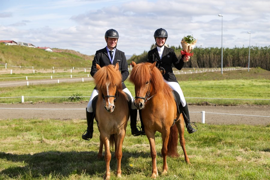 Agnar Þór Magnússon og Birna Thorlacius Tryggvadóttir á Aðalheiði og Afródítu frá Garðshorni á Þelamörk, sem voru meðal þriggja efstu fjögurra vetra hryssa í ár.