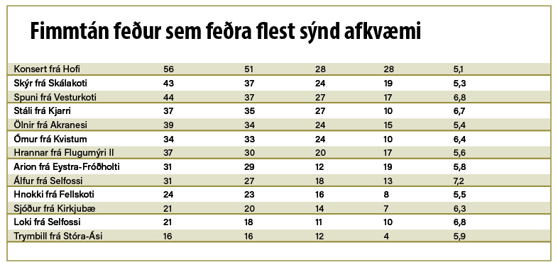 Með hæstu einkunn ársins í fjögurra vetra flokki hryssna í ár var Afródíta frá Garðshorni á Þelamörk með 8,33 í aðaleinkunn. Hún stóð efst fjögurra vetra hryssna á Landssýningunni. Ræktendur hennar eru Birna Tryggvadóttir Thorlacius og Agnar Þór Magnússon en eigandi er Sporthestar ehf. Afródíta er undan Grími frá Garðshorni á Þelamörk og heiðursverðlauna hryssunni Eldingu frá Lambanesi. Hún er fríð og vel gerð hryssa með 8,5 fyrir flesta þætti sköpulags og 9,0 fyrir fótagerð.Hún er skrefmikil, viljug og þjál alhliðahryssa með 8,5 fyrir tölt og brokk og 9,0 fyrir samstarfsvilja. Það er athyglisverður árangur að tvær af þremur efstu hryssunum í þessum flokki eru frá Garðshorni á Þelamörk og ræktaðar af þeim Birnu og Agnari.