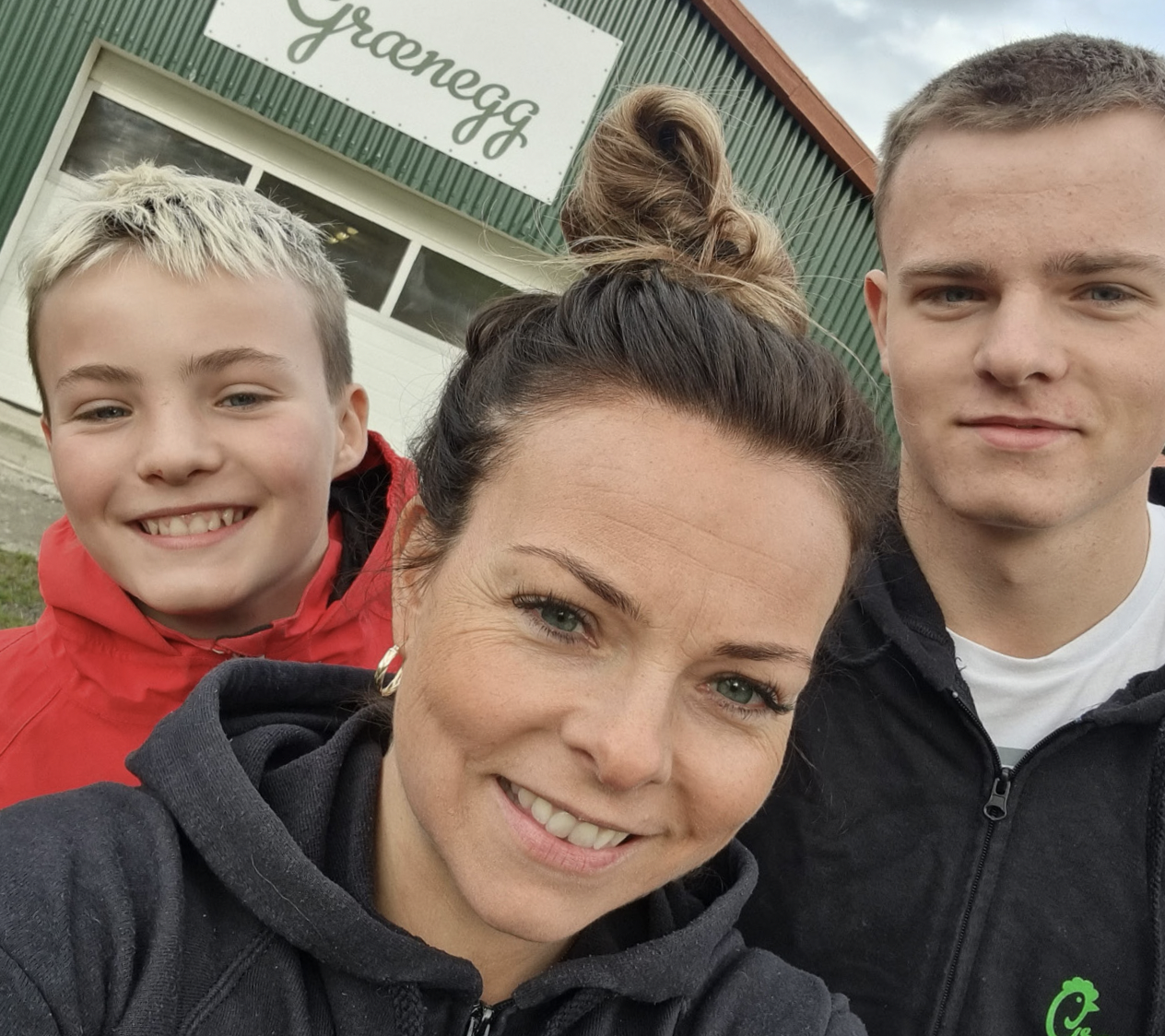 Halldóra ásamt sonum sínum fyrir utan eggjabú fjölskyldunnar, Grænegg.