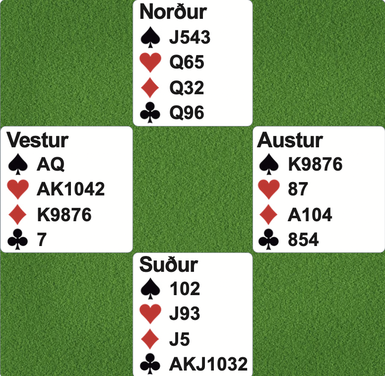 Gegn fjórum spöðum spilaði suður út laufaás. Skipti svo yfir í tígulgosa til að koma í veg fyrir að tígultaparar færu í hjartað sem suðri sýndist líklegast að brotnaði 3-3. Af sögnum að dæma gat vel hugsast að sagnhafi væri með sex spaða.