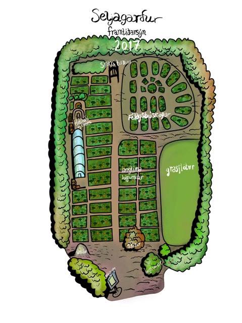 Í Seljagarði er hægt að stunda matjurtaræktun í útireitum og inni í gróðurhúsi. Á næsta ári mun hópurinn leggja grunn að félagslandbúnaði. Teikningin sýnir framtíðarsýn garðsins. Mynd / Þórey Mjallhvít