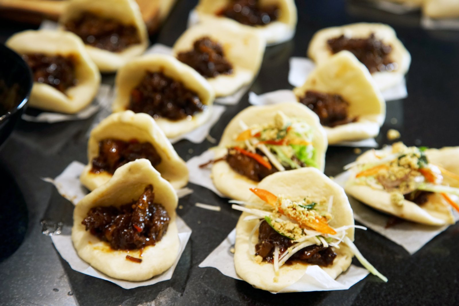 Gufusoðnar bollur:  Mótið deigið í litlar kúlur og setjð yfir plastfilmu til að halda fersku. Takið hvert stykki af deigi og rúllið út í flatkökur. Burstið deigið létt með olíu og brjótið saman. Látið hefast í  aðrar 20 mínútur (gott að setja á smjörpappír). Bollurnar er hægt að gera fyrirfram líkt og kjötið.