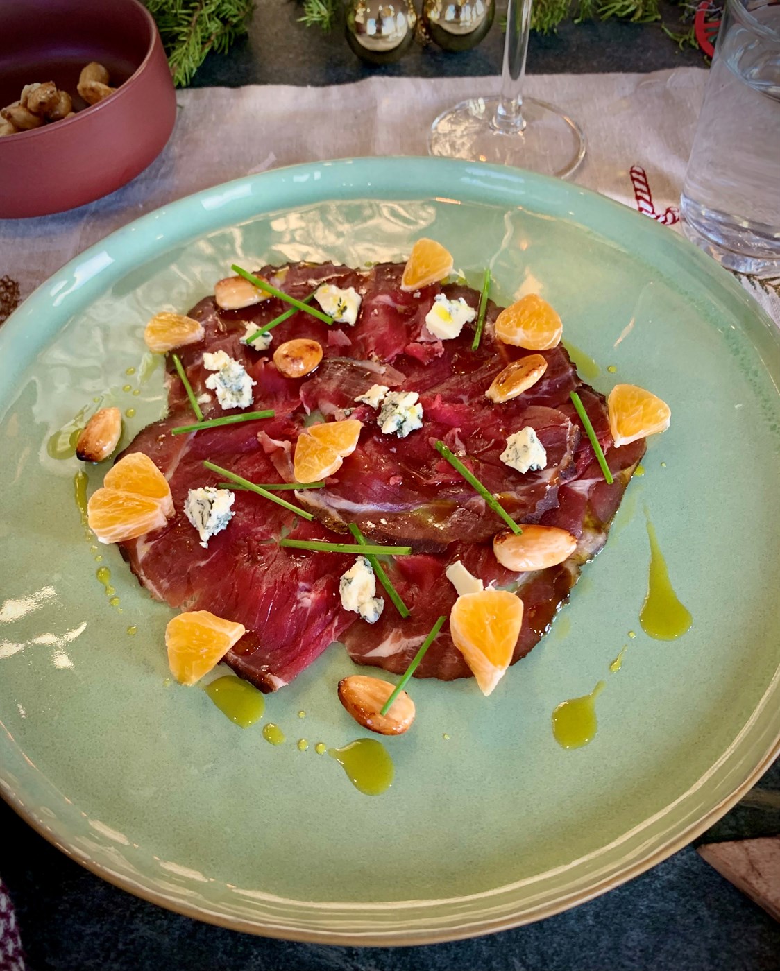 Hangikjöts-„carpaccio“ með mandarínum, möndlum og gráðaosti