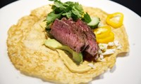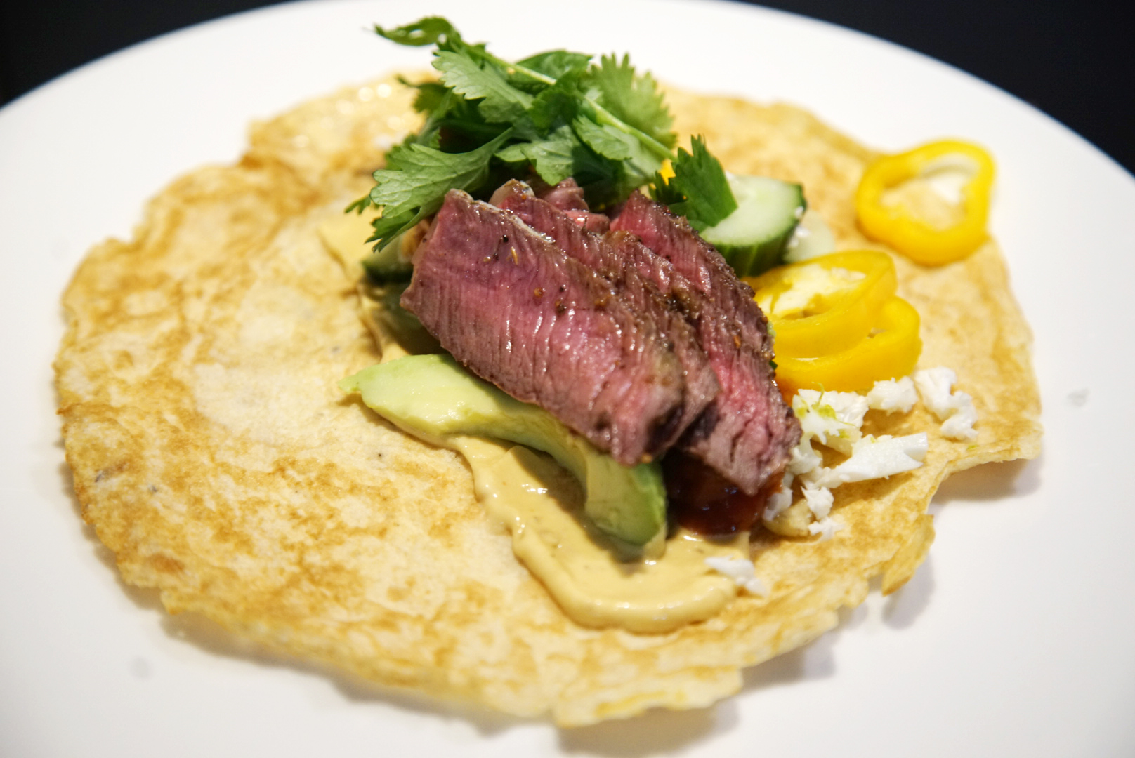 Hvort sem þið gerið tacos úr venjulegum pönnukökum eða tortillas-kökum – eða úr eggjakökuvefjum (eins og hér er gert), þá hentar vel að framreiða steik með, sem skorin er þunnt, og fylla vefjuna líka með grænmeti og sósu að eigin vali.