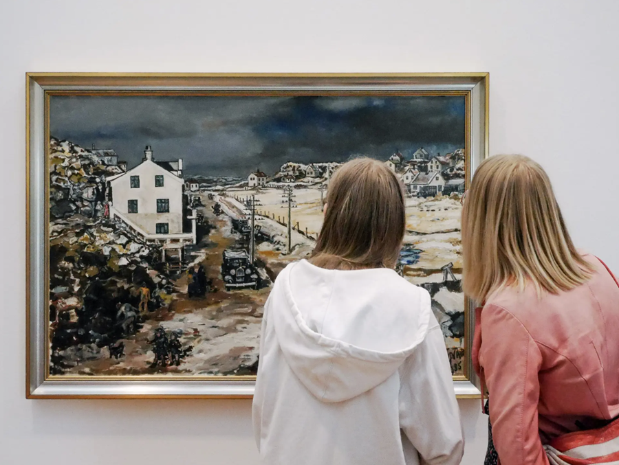 Gestir skoða eitt verkanna á sýningunni Átthagamálverkið sem nú stendur yfir á Kjarvalsstöðum.