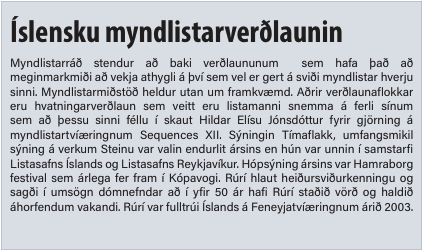 Íslensku myndlistarverðlaunin voru veitt í níunda skipti og var Finnbogi Pétursson valinn myndlistarmaður ársins 2026 fyrir sýninguna Skjálfti í Listasafni Árnesinga.