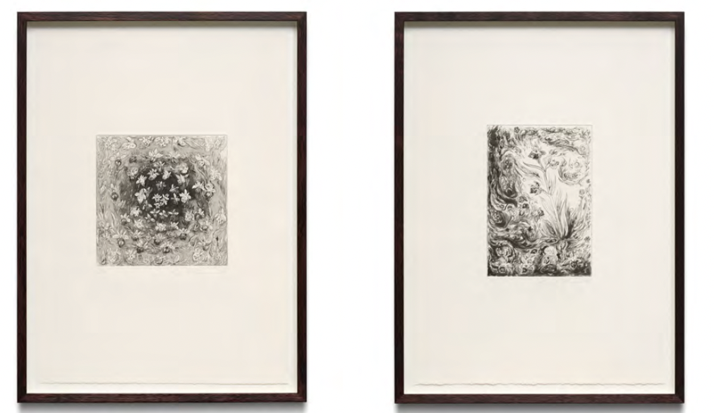 Verkin kalla fram í hugann andstæðar táknmyndir. Í þeim má finna jafnt Edensgarðinn og elda vítis. Í því samhengi er áhugavert að á sýningunni er einnig röð fimmtán nýrra grafíkverka sem Eggert hefur unnið í tengslum við væntanlega útgáfu Paradísar úr Gleðileiknum guðdómlega eftir Dante í þýðingu Einars Thoroddsen, en þessi þriðji og síðasti hluti verksins lýsir ferðalagi sálarinnar í átt til ljóssins, friðarins og hins guðdómlega. Fyrsti hlutinn heitir Víti og annar Skírnarfjallið. Í grafíkverkunum slær jörð og himni aftur saman og skapa úr mismuni sínum samtal um efni og anda, hið höndlanlega og óhöndlanlega.