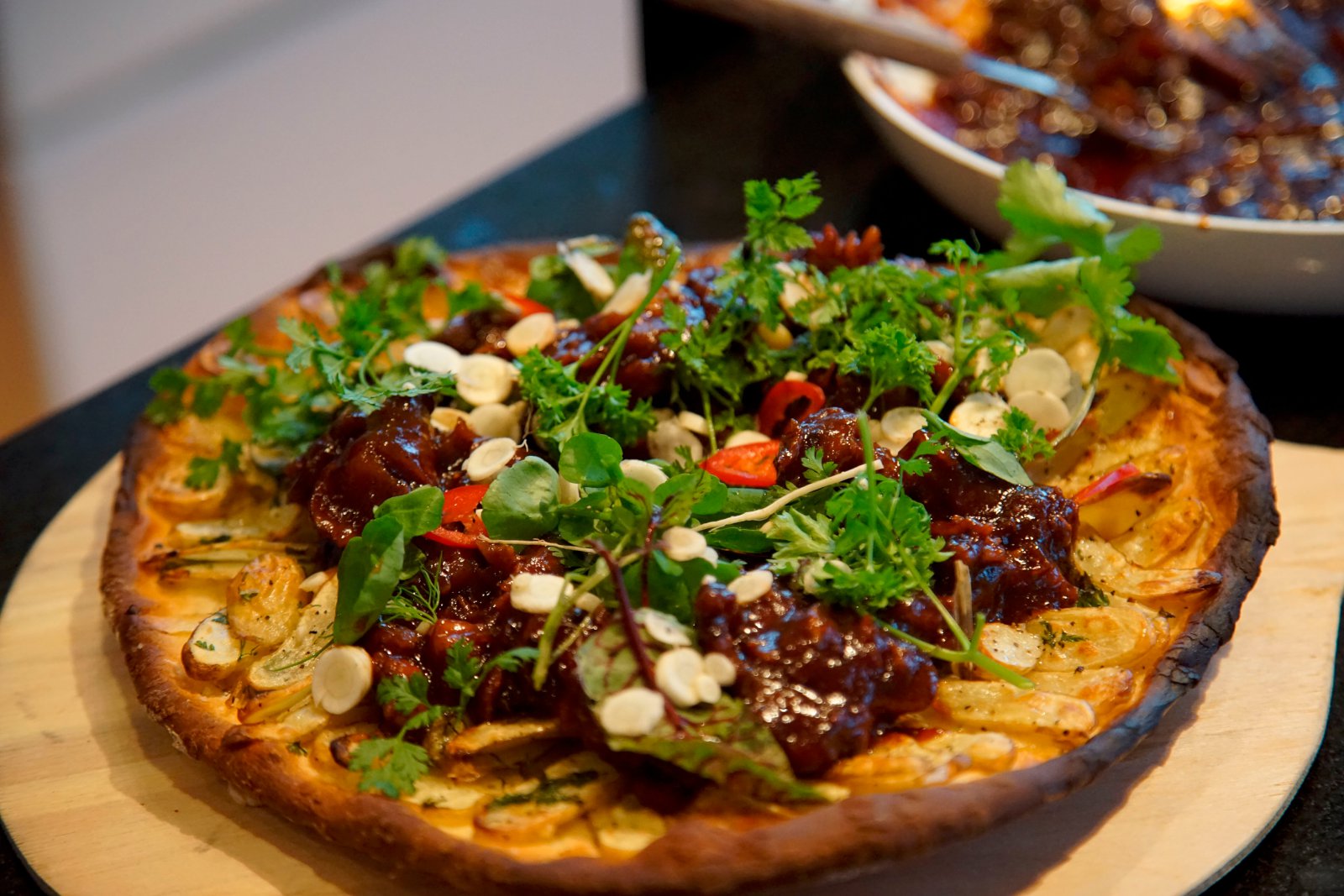 Stráið um 2 til 3 matskeiðum af hveiti á borð og fletjið deigið út. Raðið þunnt skornum kartöflum á deigið (gott að velta þeim upp úr smjöri eða hvítlauksolíu).