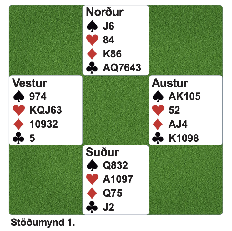 Ómar Íslandsmeistari tók ákveðna áhættu með því að passa. Einhver hefði kannski meldað 3grönd í von um 10 punkta hjá makker eða doblað með það í huga að breyta hjartasögn frá makker í spaða? En Ómar passaði fumlaust og nú lá mikið við hjá vestri að kreista út úr sér úttektardobl, stundum kallað verndardobl í þessari stöðu. Þótt punktarnir séu aðeins sex dró Sveinn Ragnarsson í vestur upp doblmiðann. Ómar sat og 300 kall til Íslandsmeistarans og Sveins. Hreinn toppur.