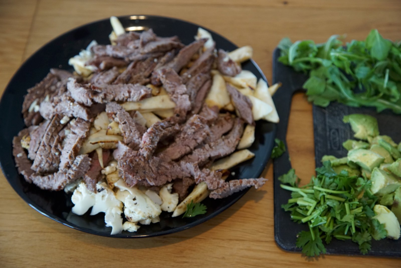 Takið restina af hvítlauknum ásamt fjórum matskeiðum af olíu og setjið blómkál á grillpönnu eða útigrill. Kryddið með salti og pipar. Hyljið með álpappír og bakið í 45 mínútur þar til hnapparnir eru  fallega brúnaðir og blómkálið aðeins karamellað að sjá. Látið steikina standa í 15 til 20 mínútur. Skerið í þunnar sneiðar. Kryddið með salti og pipar. Berið fram með blómkálinu, sellerírótinni (í þunnum þynnum) fersku salati og góðu salsa.