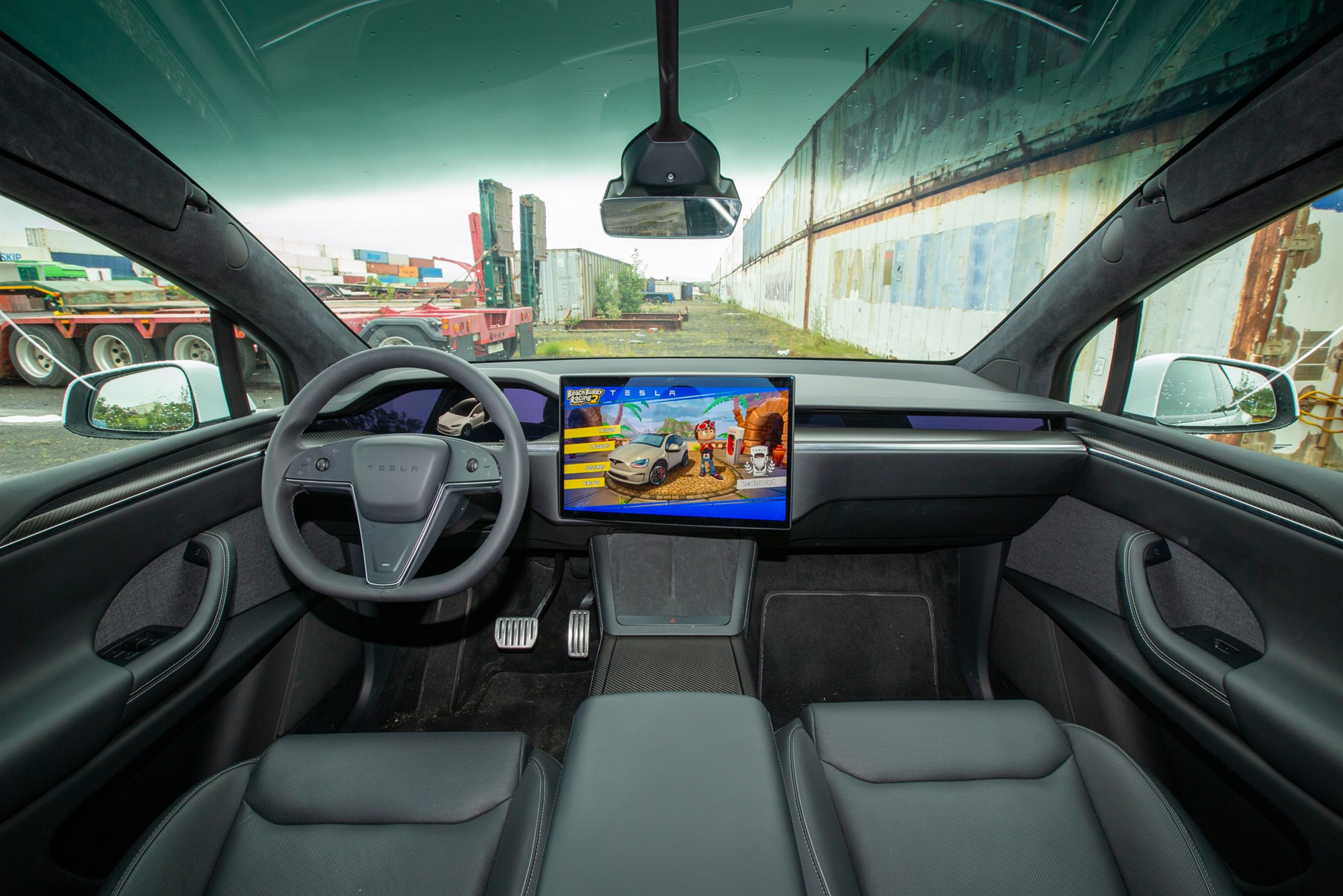 Innréttingin er svört með mjúku áklæði sem líkist leðri og í hurðaspjöldunum er jafnframt smá grátt tauáklæði. Ólíkt minni Tesla-bílum er þessi með mælaborðsskjá beint framan við ökumanninn. Þar sjást grunnupplýsingar, eins og hvað sjálfstýringin er að hugsa, aksturshraði, gír, hleðsla og fleira.