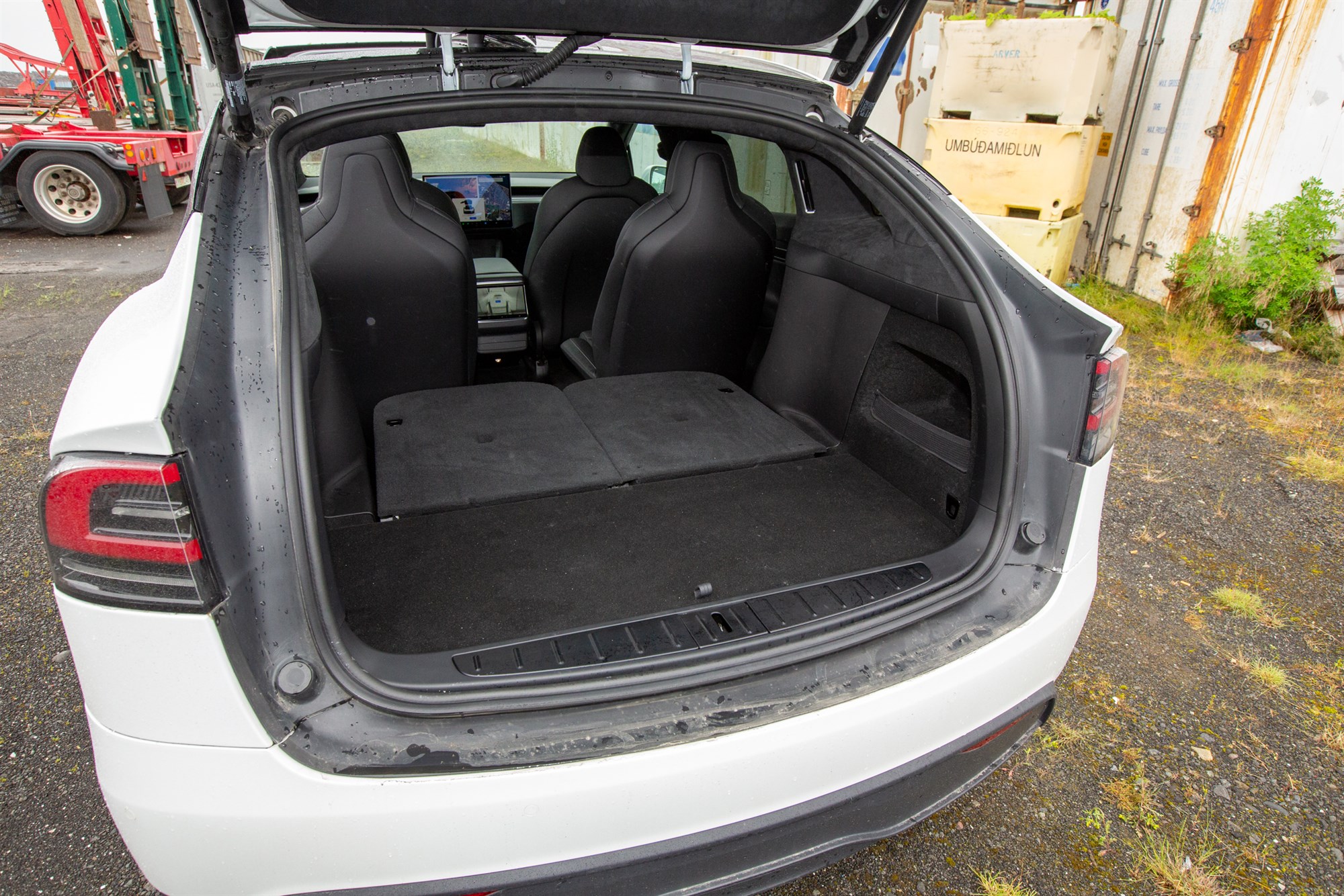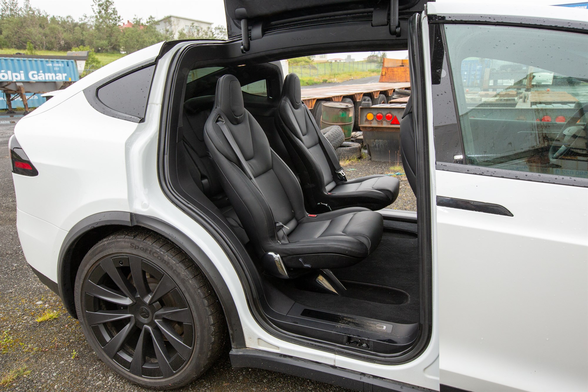 Í þessum bíl var önnur sætaröðin með tvo sjálfstæða stóla sem rúma fullorðið fólk með sóma og er hægt að stilla með rafmagni, en kaupendur geta líka valið þriggja sæta bekk. Aftursætisfarþegarnir eru með sinn eigin skjá þar sem þeir geta stillt miðstöð eða nálgast afþreyingarefni. Á milli stólanna er autt rými og flatt gólf. Í þriðju sætaröðinni er pláss fyrir tvo einstaklinga í minni kantinum. Höfuðplássið er skert og fótaplássið er nánast ekkert, nema þeim sé skáskotið á milli annarrar sætaraðar. Þar að auki minnkar geymsluplássið í skottinu til muna ef öftustu sætin eru uppi. Þegar þau eru niðri er Tesla X með stórt og fínt skott og þökk sé myndarlegum skotthlera er aðgengið til sóma.