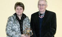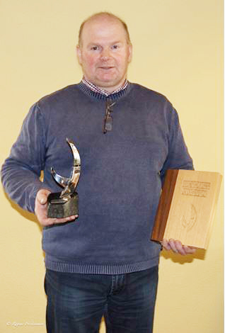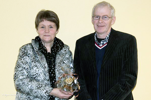 Verðlaun voru í fyrsta sinn veitt á aðalfundi fyrir hæst dæmdu kýrnar en þau byggja á byggingardómi og afurðum kúa fæddum árið 2011. Verðlaunin hlutu kýrnar Bára frá Hrafnsstöðum, Fagra frá Múla I og Milla frá Skútustöðum II. Unnur og Flosi eru hér á mynd með verðlaunagripinn fyrir hæst dæmdu kúna. Frá þessu er sagt á vefnum 641.is.
