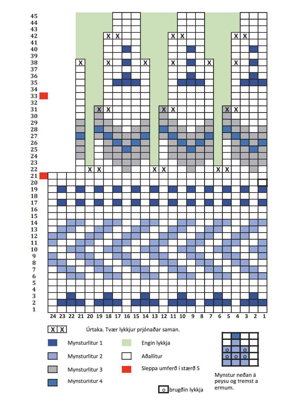 Úrtaka: Í fyrstu úrtöku þurfa að vera 203-224-252 lykkjur á prjóninum. Í stærð S þarf því að fækka um 1 lykkju á undan úrtöku og í stærð M-L að fækka um 4 lykkjur jafnt yfir prjóninn. Hægt er að gera það jafnóðum og tekið er úr. Tvö X saman tákna 2 lykkjur prjónaðar saman. Í hverri úrtöku fækkar um 29-32-36 lykkjur. Eftir 4 úrtökur eru því á prjóninum 87-96-108 lykkjur. Takið úr til viðbótar í næstsíðustu umferð 15-18-22 lykkjur jafnt yfir prjóninn. Þá eru í hálsmáli 72-78-86 lykkjur. Hægt er að taka meira úr til að þrengja hálsmál ef vill. Hér er mælt með snúrukanti (I-cord). Notið 4,5 mm prjón. Snúrukantur er gerður þannig: Prjónið tvær lykkjur, prjónið tvær lykkjur saman, setjið þessar þrjár aftur upp á vinstri prjóninn og endurtakið þar til komið er að enda. Þegar hálsmál er með snúrukanti þarf það að vera aðeins vítt, þar sem þessi affelling gefur ekki eftir. Hægt er að taka minna úr í síðustu úrtökunni og hafa hálsmál víðara og þó mælt sé með snúrukanti hér, er hægt að gera hálsmál hvernig sem óskað er.
