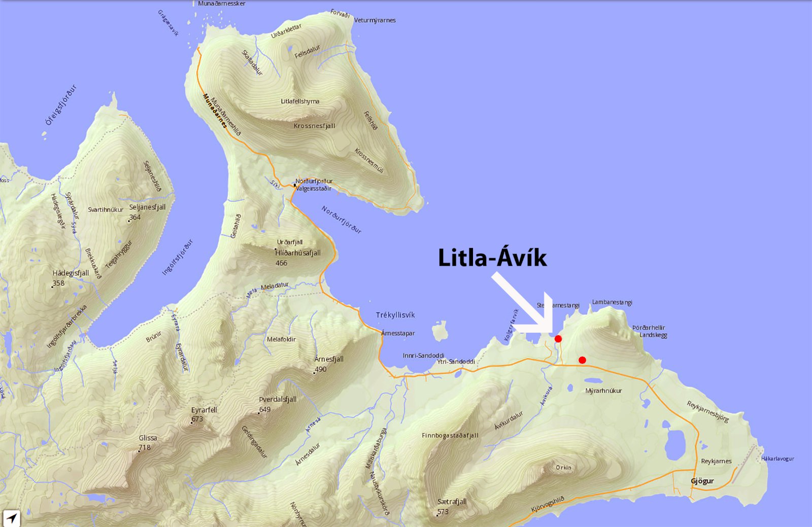 Bæjarhúsin í Litlu-Ávík standa fyrir ofan Ávík og eru undir vesturhlíðum Reykjaneshyrnu. Til norðvesturs er útsýni beint inn Norðurfjörðinn.