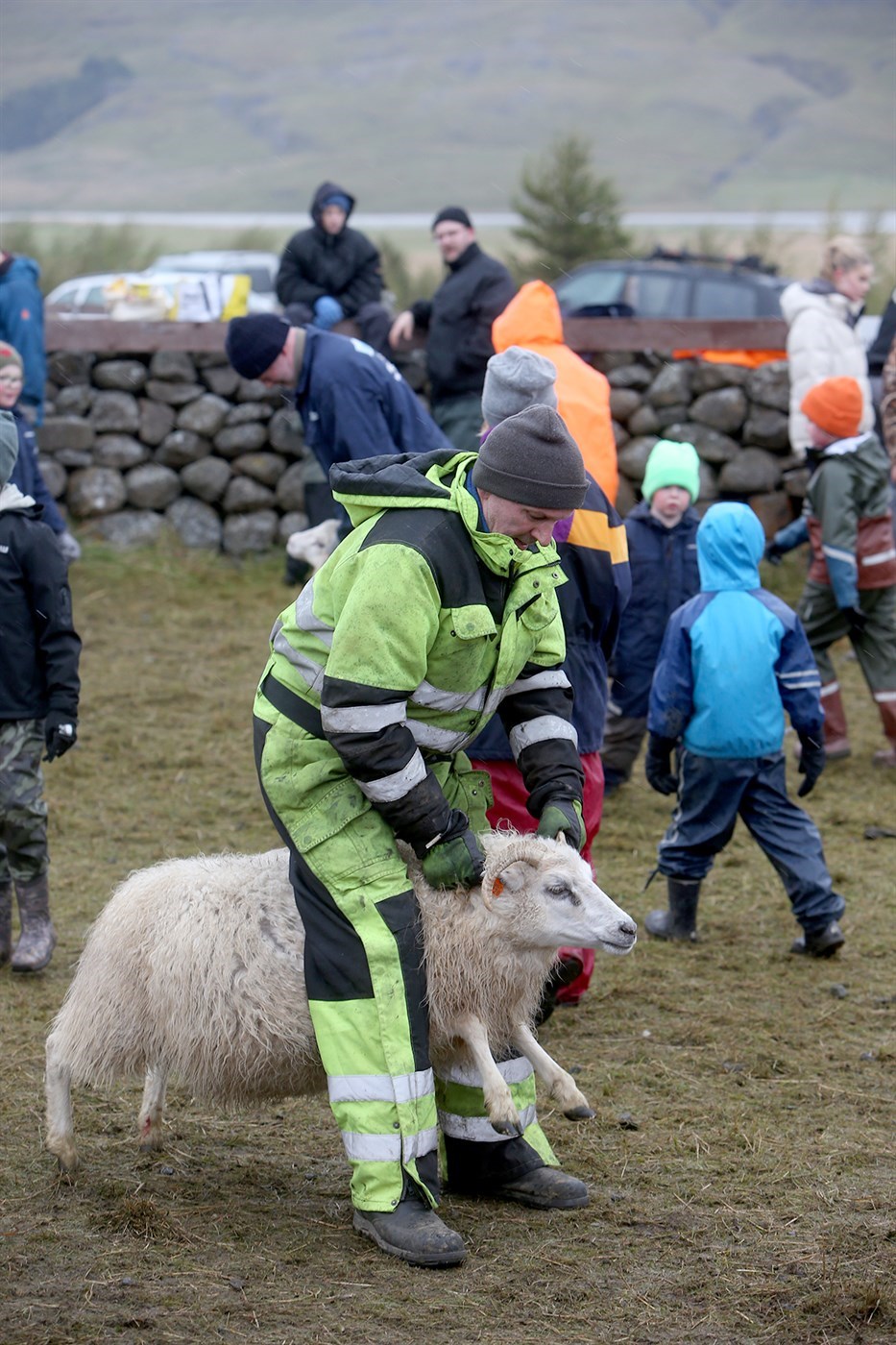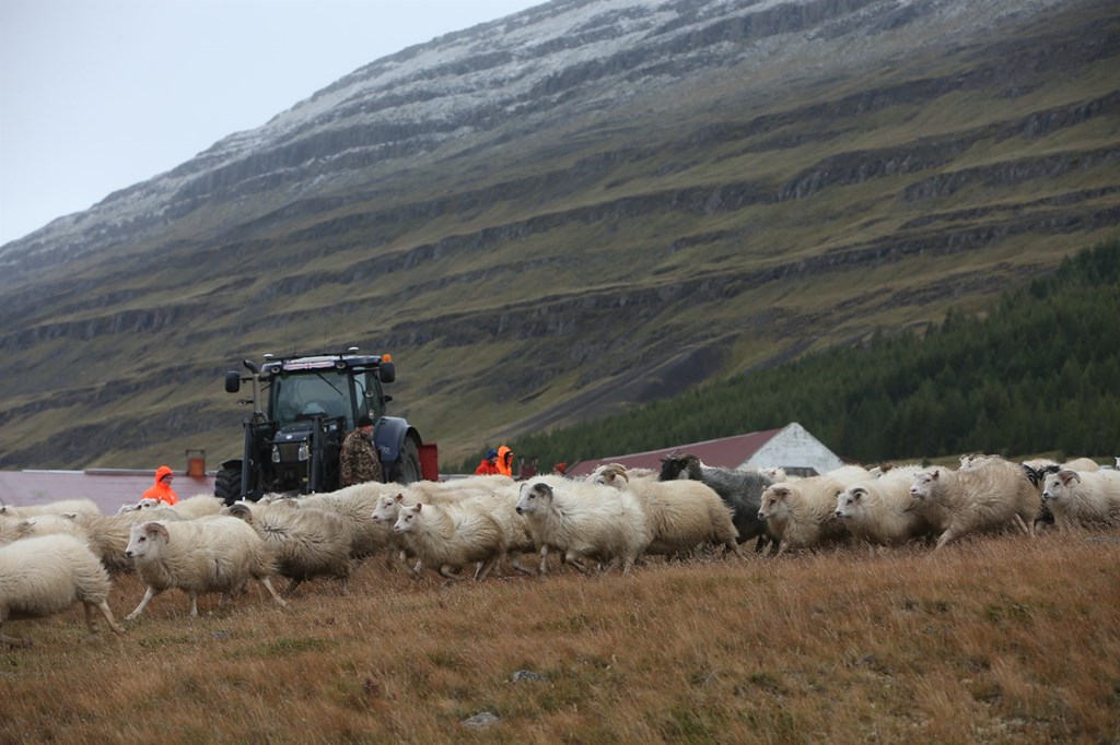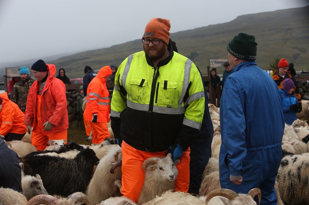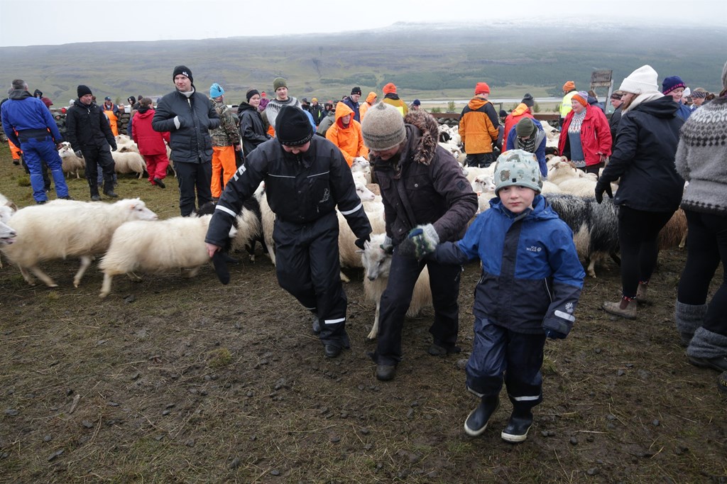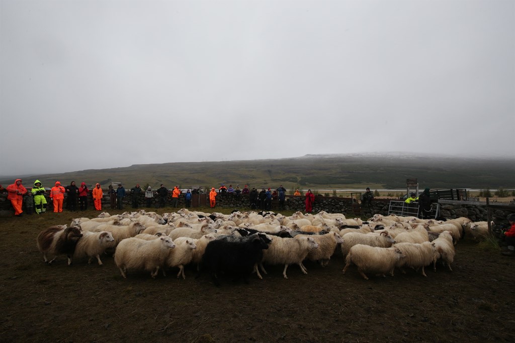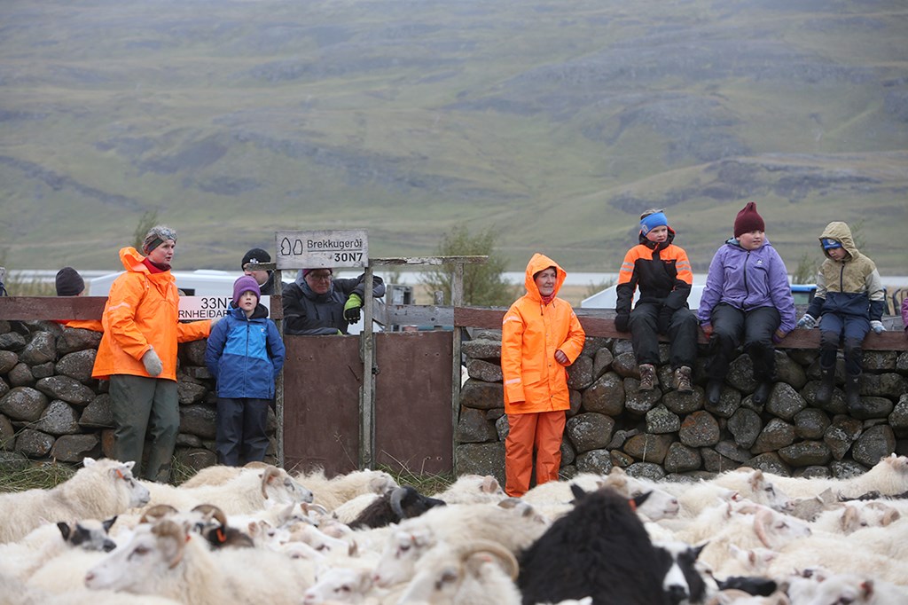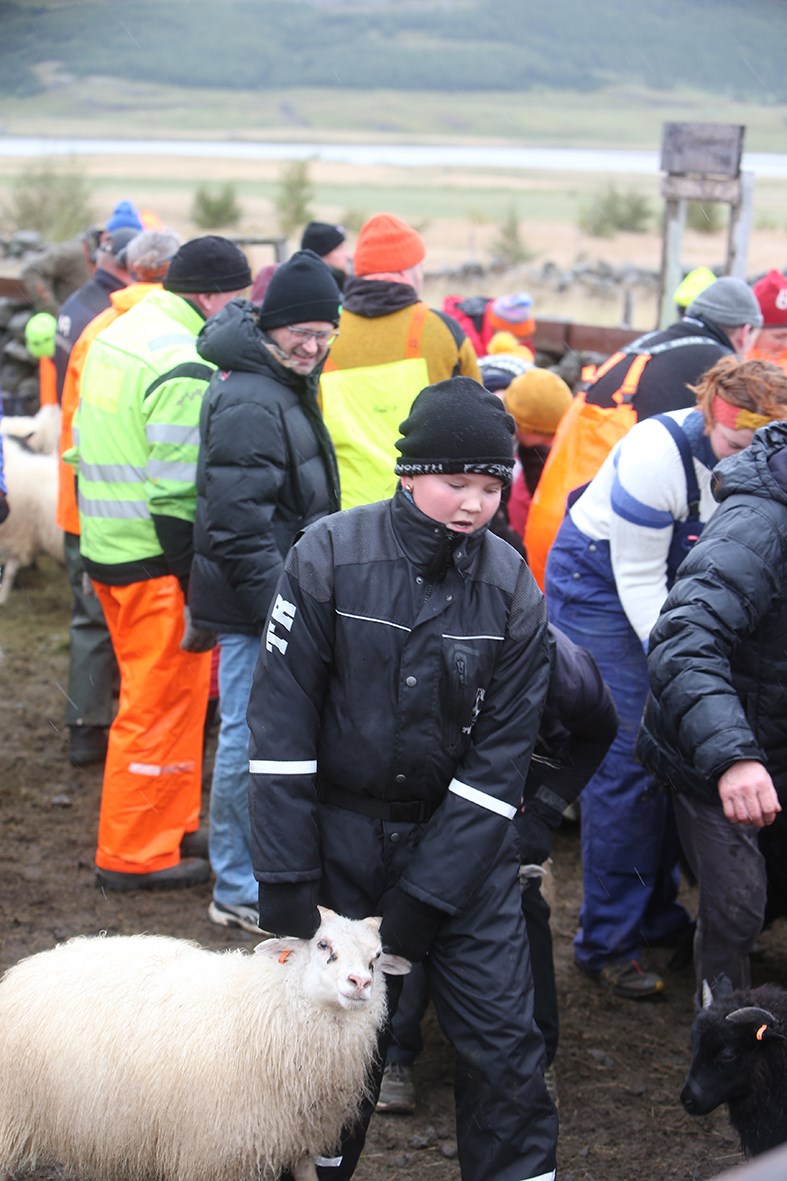 Þessar snöru stúlkur drógu skjáturnar nauðugar viljugar í rétta dilka og létu sauðþráann í fénu ekki aftra sér frá því að koma því á sinn stað.