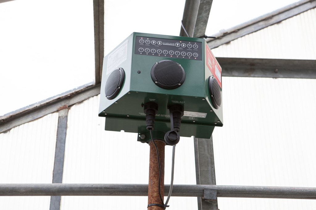 Til að halda smáfuglunum frá berjunum, einkum skógarþrestinum, er notast við þessa fuglafælu frá Fuglavörnum.