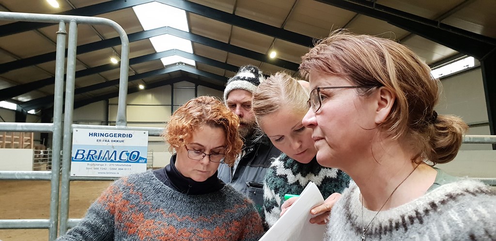 Frá vinstri, Lotta í Hemru. Steinn í Hjarðarbrekku, Kristín á Arngeirsstöðum og Hulda á Tyrfingsstöðum bera saman bækur sínar og fara yfir dómarablaðið.