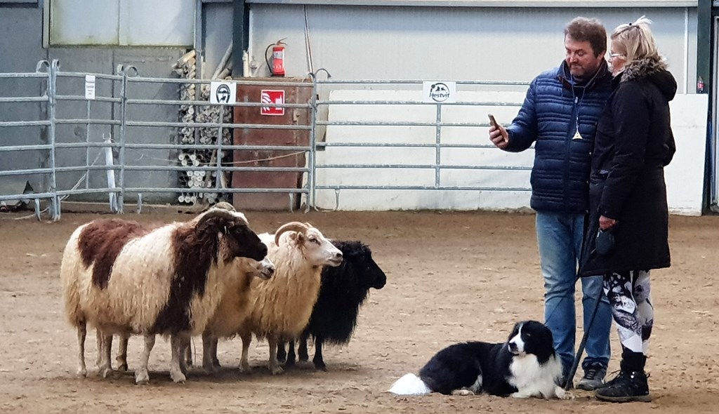 Kristinn Hákonarson var með smalahundasýningu í reiðhöllinni. Hér er hann að sýna Sólveigu Pálmadóttur á Selfossi eitthvað sniðugt í símanum sínum. Hundurinn og kindurnar bíða á meðan.