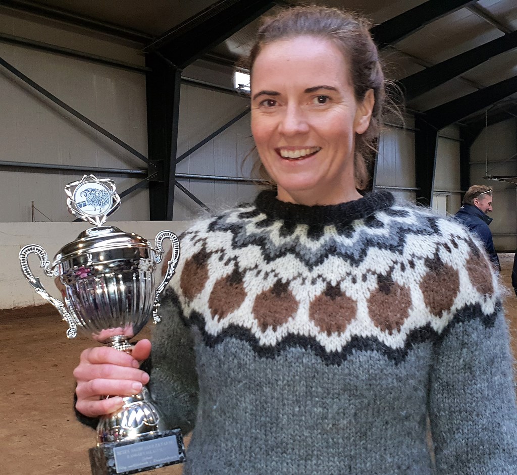 Sauðfjárræktarbúið á Butru í Fljótshlíð var valið ræktunarbú ársins 2017 í Rangárvallasýslu á sýningunni en þar búa hjónin Oddný Steina Valsdóttir, formaður Landssambands sauðfjárbænda og Ágúst Jensson, hér með viðurkenningarskjalið og bikarinn sem þau fengu. Með þeim eru börnin þeirra, Valur og Auður, en Jens Eyvindur er í hvarfi. Í Butru eru um 500 vetrarfóðraðar kindur. Meðalkynbótamat ánna á búinu hefur hækkað um 0,52 stig á ári fyrir árabilið 2010–2016. Myndir / Magnús Hlynur Hreiðarsson