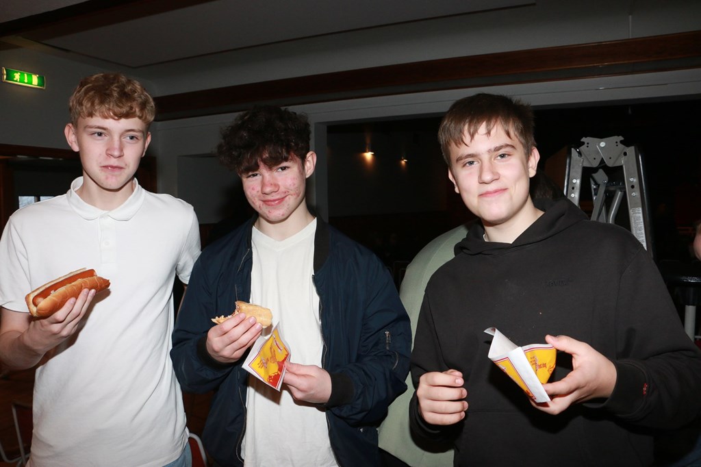 Nemendum var meðal annars boðið í pylsupartí í hádeginu á afmælisdaginn, sem allir kunnu vel að meta. Hér eru þeir frá vinstri, Jón Oliver Rúnarsson í 9. bekk frá Súluholti, Styrkár Freyr Birgisson í 9. bekk frá Oddgeirshólum og Albert Hellsten Högnason í