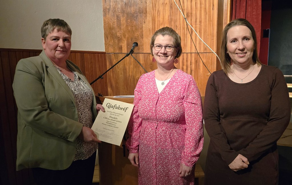 Kvenfélag Villingaholtshrepps færði skólanum 800.000 króna peningagjöf til kaupa á leiktækjum á skólalóðina. Hér tekur Þórunn við gjafabréfinu frá þeim Ósk Unnarsdóttur og Miu Hellsten úr stjórn kvenfélagsins.