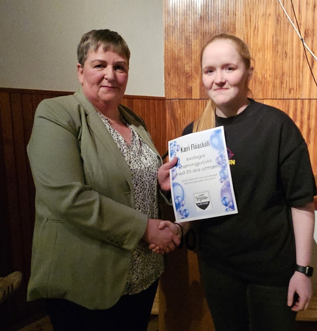 9. bekk, og Hugrún Svala Guðjónsdóttir frá Þjórsárnesi, nemandi í 10. bekk, lýstu því skemmtilega fyrir afmælisgestum hvernig er að vera nemandi í Flóaskóla