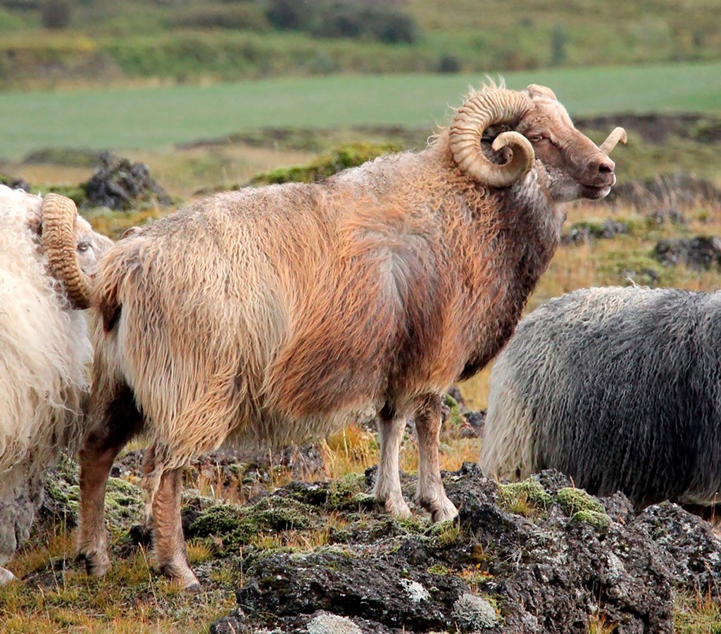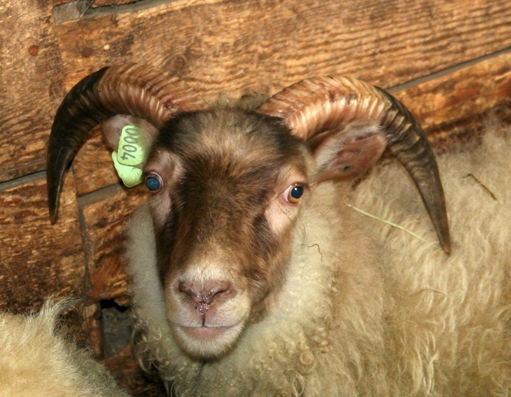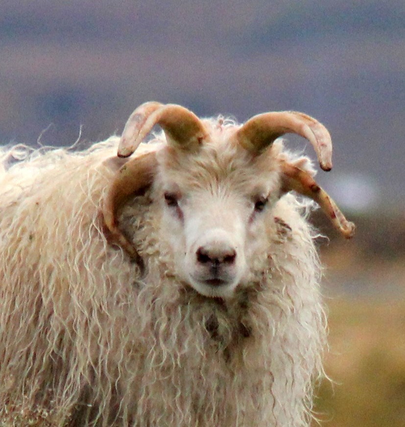 Hvítur lambhrútur, ferhyrndur.