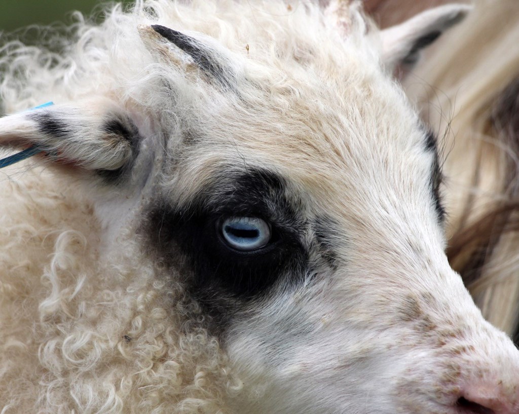 Svartbaugótt gimbur með ísbláan hring í auga.
