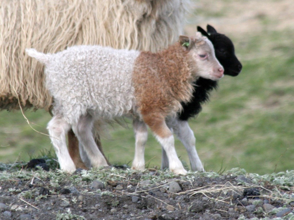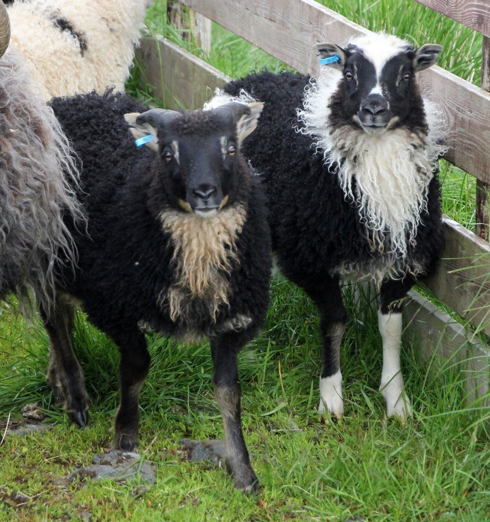 Grá-jakobsbíldótt (grátt á nefi umhverfis augu og á eyrum) gimbrarlamb og svartbotnótt hrútlamb.