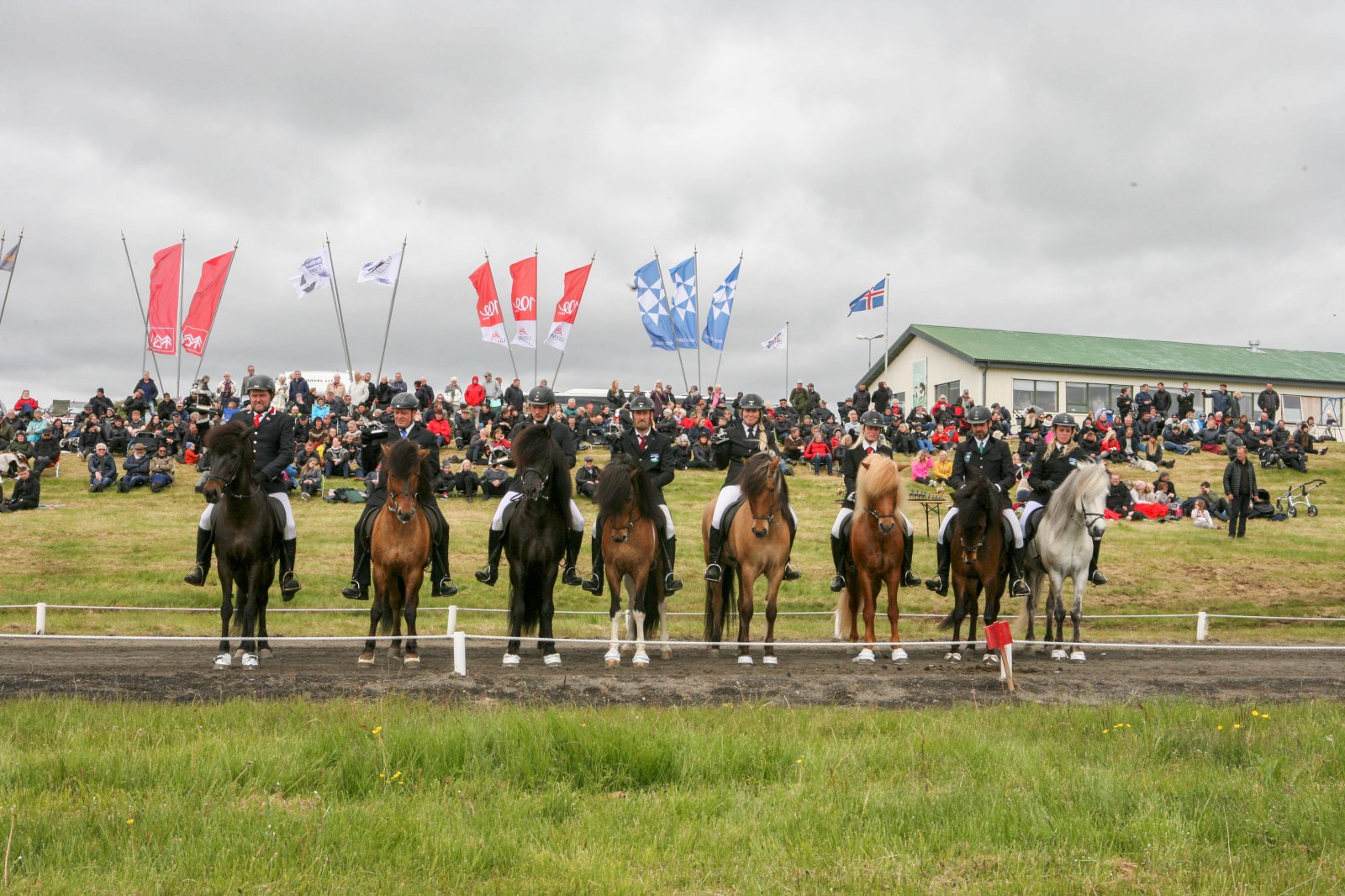 Firnasterkri keppni í B-flokki gæðinga lauk með öruggum sigri Örnu frá Skipaskaga, knapi er Sigurður Sigurðarson, sem eru hér lengst til vinstri. Annar var Oddi frá Hafsteinsstöðum og Skapti Steinbjörnsson, þriðju Bragur frá Ytra-Hól og Flosi Ólafsson, þá koma Steggur frá Hrísdal og Siguroddur Pétursson, Sóllilja frá Hamarsey og Helga Una Björnsdóttir, Hrynur frá Hrísdal og Ásdís Sigurðardóttir, Ósvör frá Lækjamóti og Ísólfur Líndal Þórisson og Hnokki frá Reykhólum og Hrefna Rós Lárusdóttir.