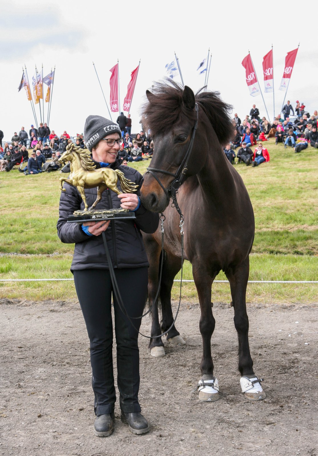 Sigurveig Sigurðardóttir, hrossaræktandi í Skipaskaga, tekur við verðlaunum Örnu frá Skipaskaga sem var valin hestur Fjórðungsmótsins.