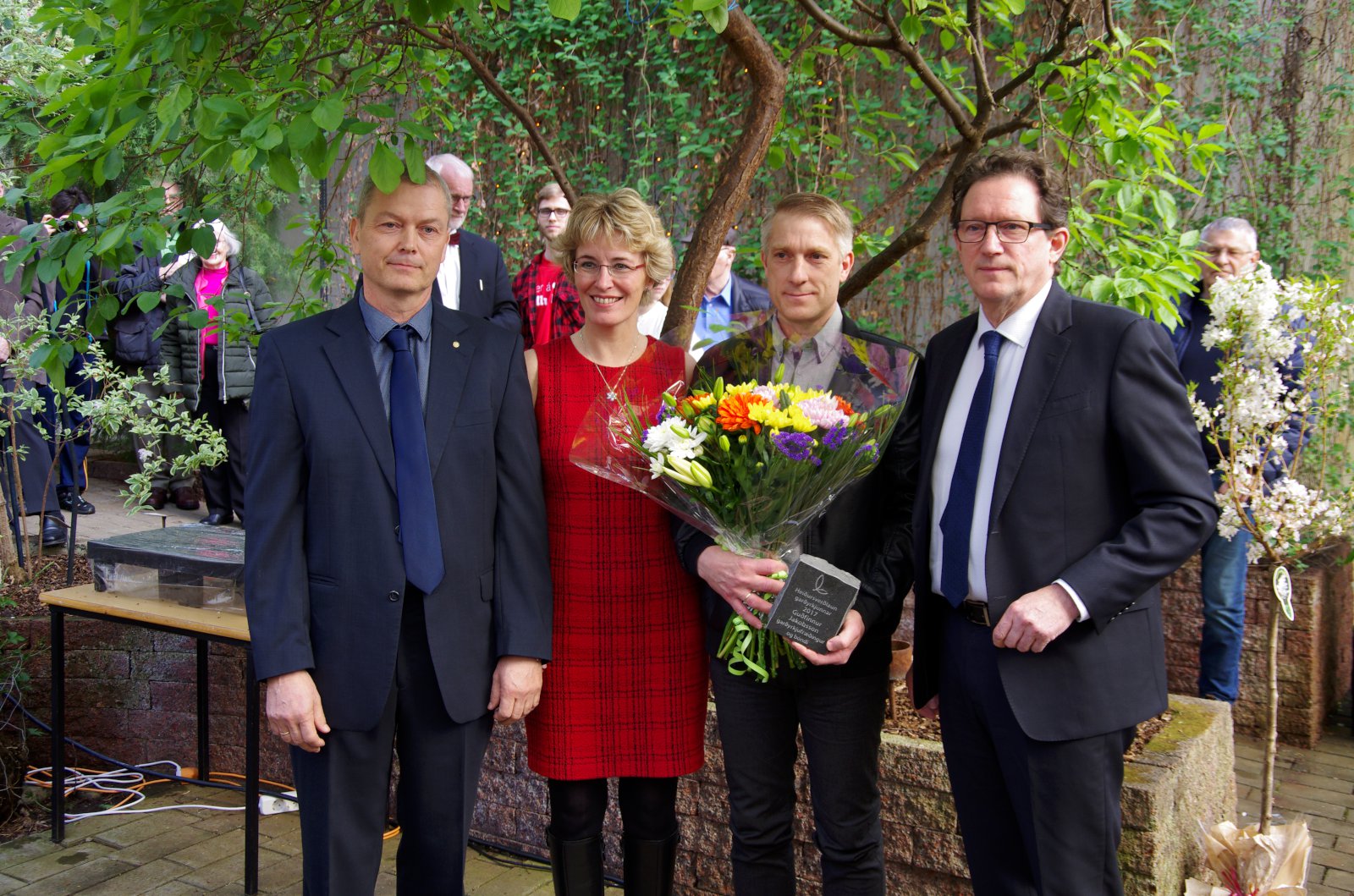 Guðfinnur Jakobsson, garðyrkjubóndi í Skaftholti í Skeiða- og Gnúpverjahreppi, hlaut garðyrkjuverðlaunin 2017. Sökum veikinda tók Gunnþór, sonur hans, við verðlaununum úr hendi Kristjáns Þórs Júlíussonar. Hér eru, talið frá vinstri: Björgvin Örn Eggertsson, Guðríður Helgadóttir, Gunnþór Guðfinnsson og Kristján Þór Júlíusson.