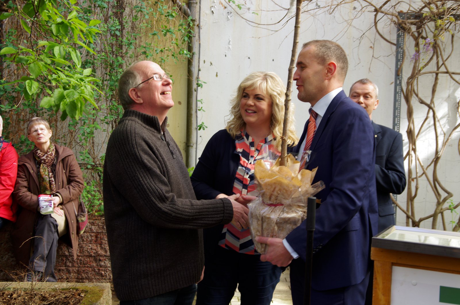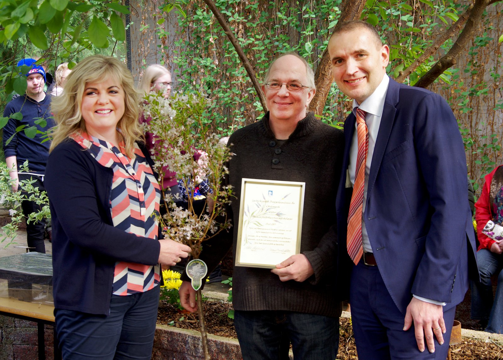 Garðyrkjustöð dvalarheimilisins Áss hlaut umverfisverðlaun Hveragerðisbæjar í ár. Það var Valdimar Ingi Guðmundsson sem tók við verðlaununum úr hendi Guðna Th. Jóhannessonar, forseta Íslands. Með þeim á myndinni er Aldís Hafsteinsdóttir bæjarstjóri Hveragerðisbæjar.