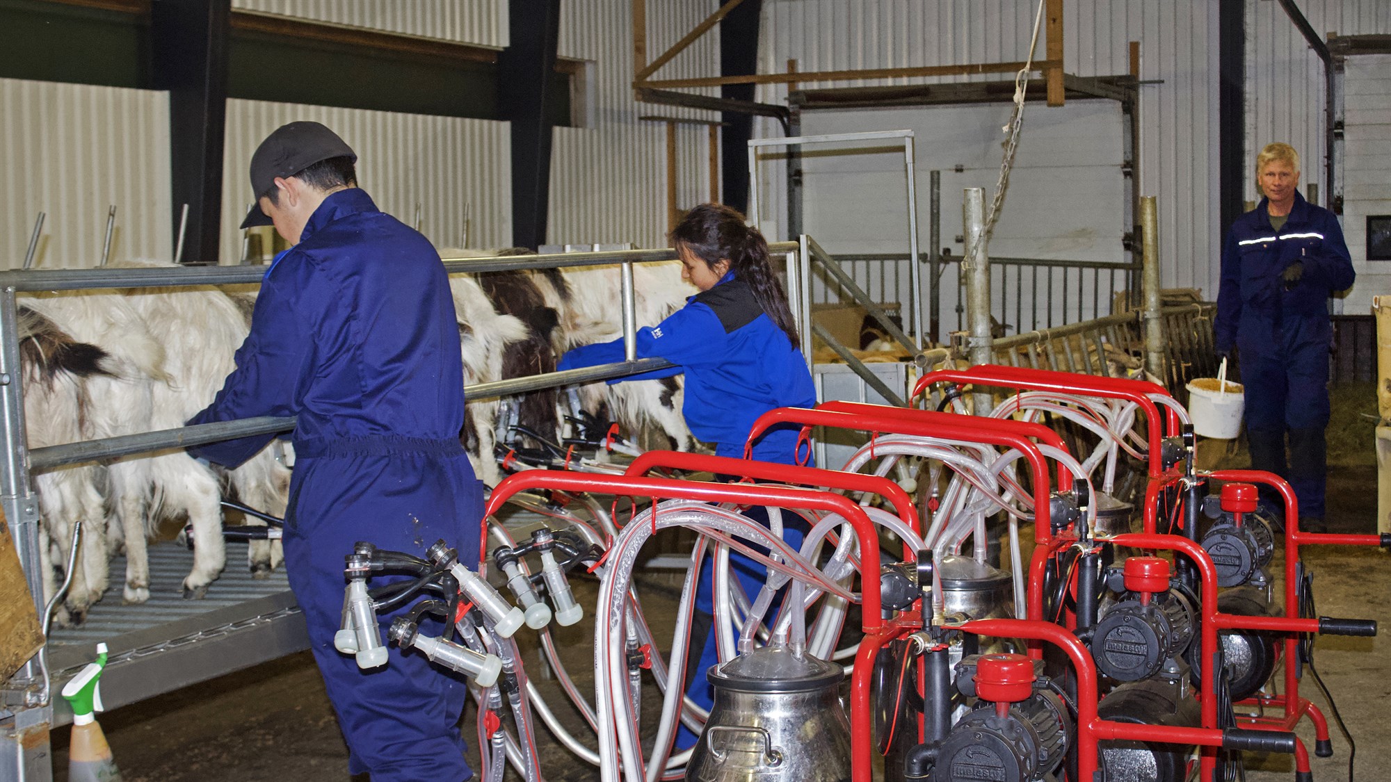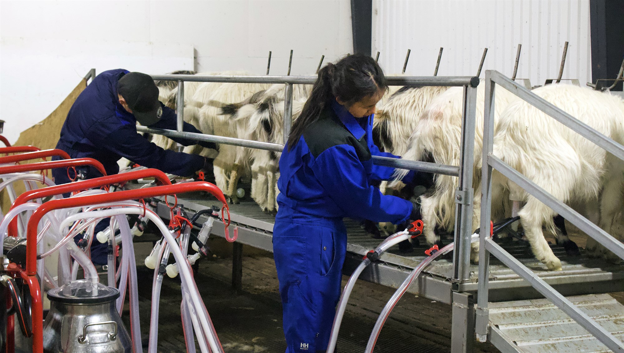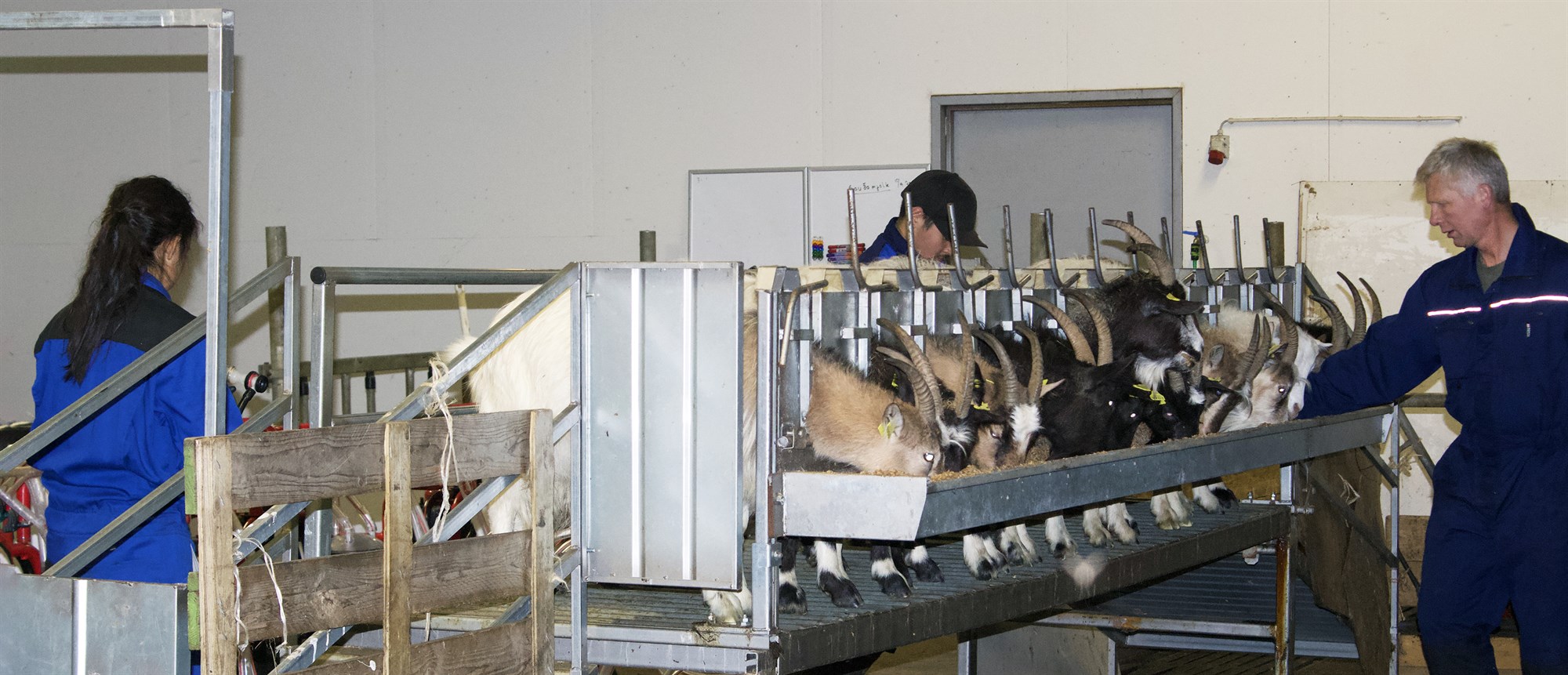 Hér er verið að mjólka geiturnar. Ábúendur á Brúnastöðum hafa mjólkað 35 geitur undanfarnar vikur. Mjólkin er fryst og unnið úr henni í lotum.