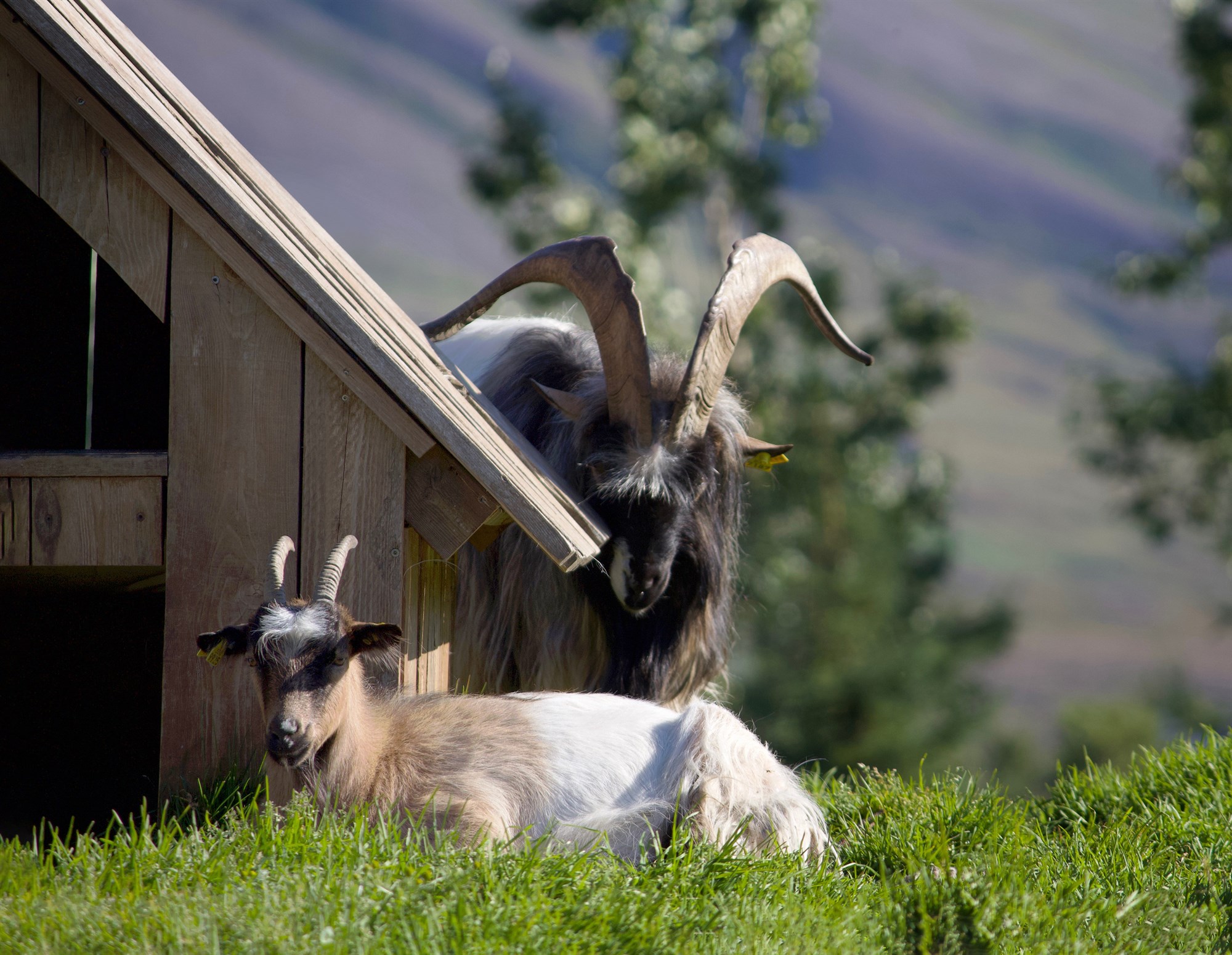 Geiturnar á Brúnastöðum hafa færi á að spranga um undir fjallgarðinum á Tröllaskaga. Líka að láta fara vel um sig heima við.