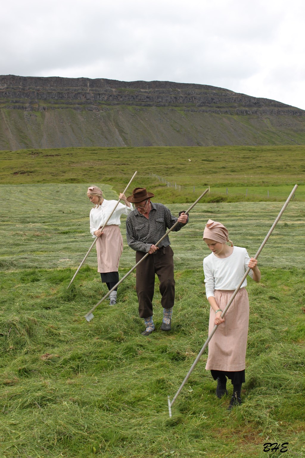 Utandyra mátti sjá fólk í heyskap.