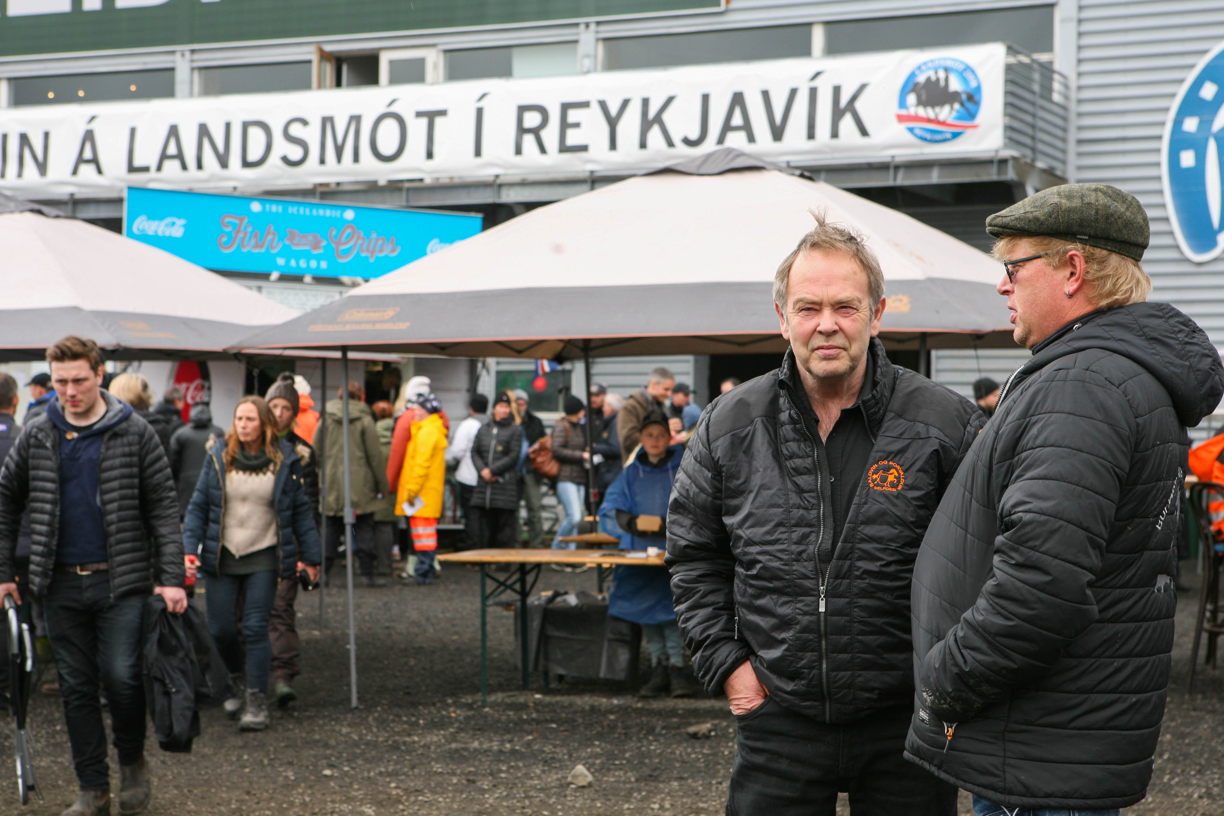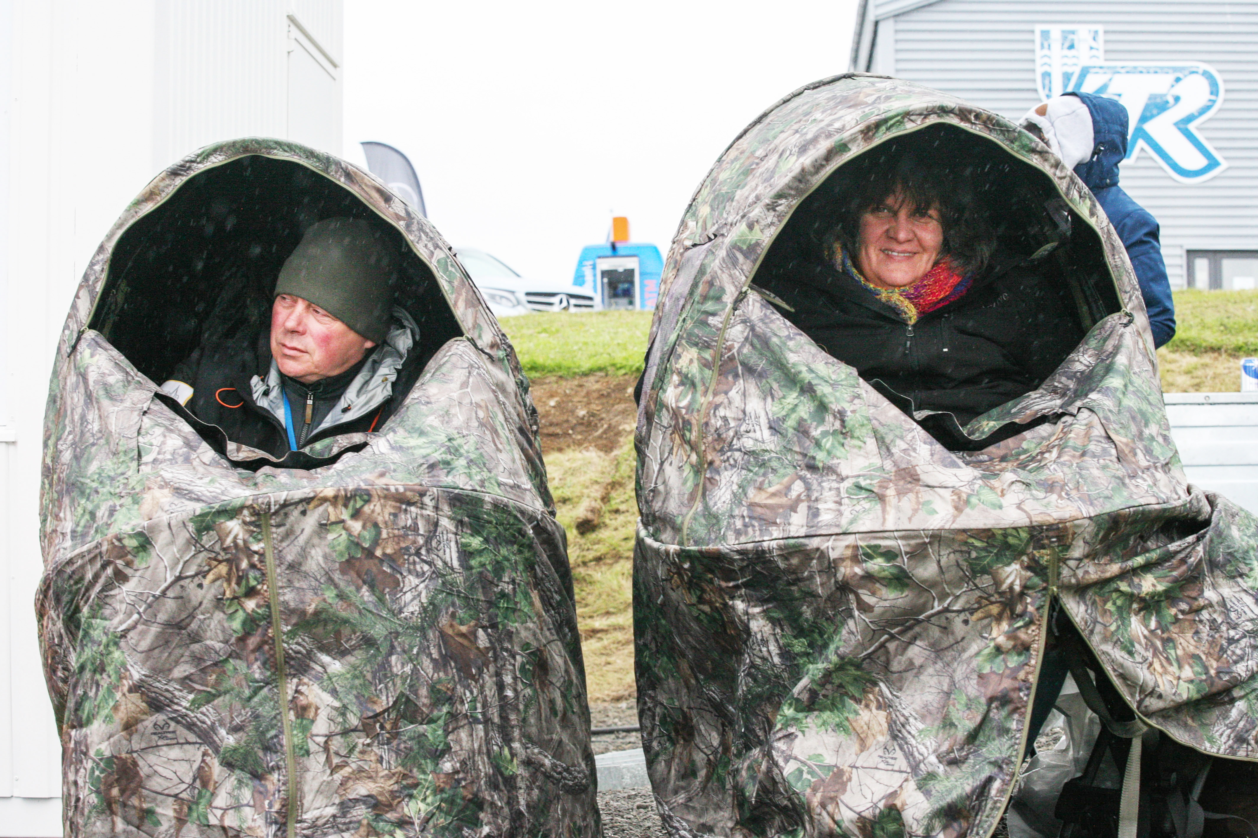 Útbúnaður sem vakti athygli. Þessi hjón voru við öllum veðrum og vindum búin, lokuðu svo að sér á milli atriða.