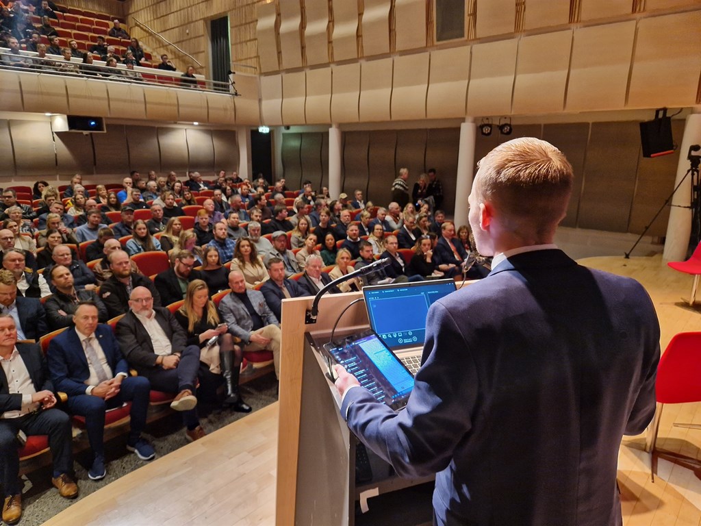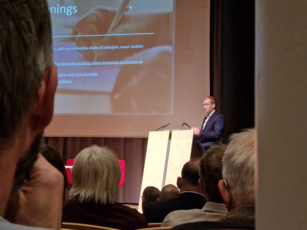 Tíu framsögumenn héldu erindi. Hér stendur Jón Helgi Helgason kartöflubóndi í pontu og bendir á að margir bændur stuðli að fæðuöryggi þjóðarinnar í sjálfboðavinnu.
